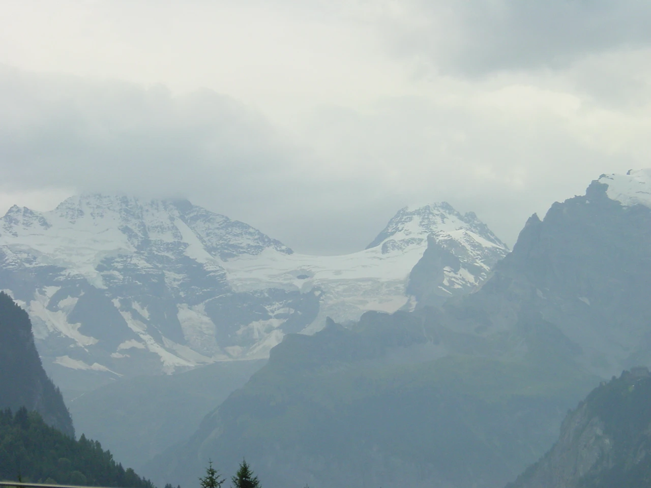 Cloud-shrouded Breithorn and Tschingelhorn, climbing from Wengen to Kleine Scheidegg.