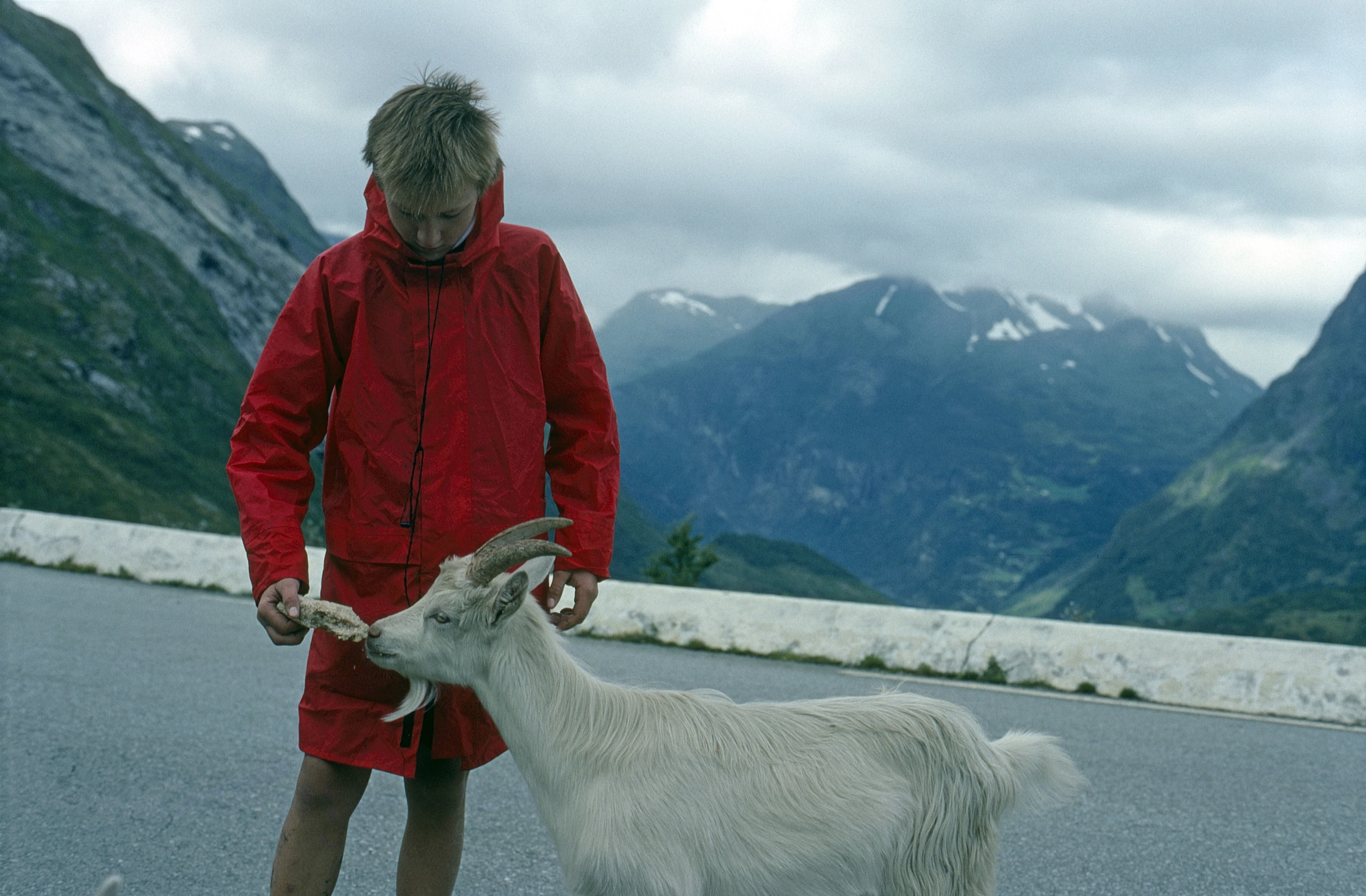 Hairpin picnic: Shane shares his sandwich with a goat, Geirangerfjord’s mountains beyond.