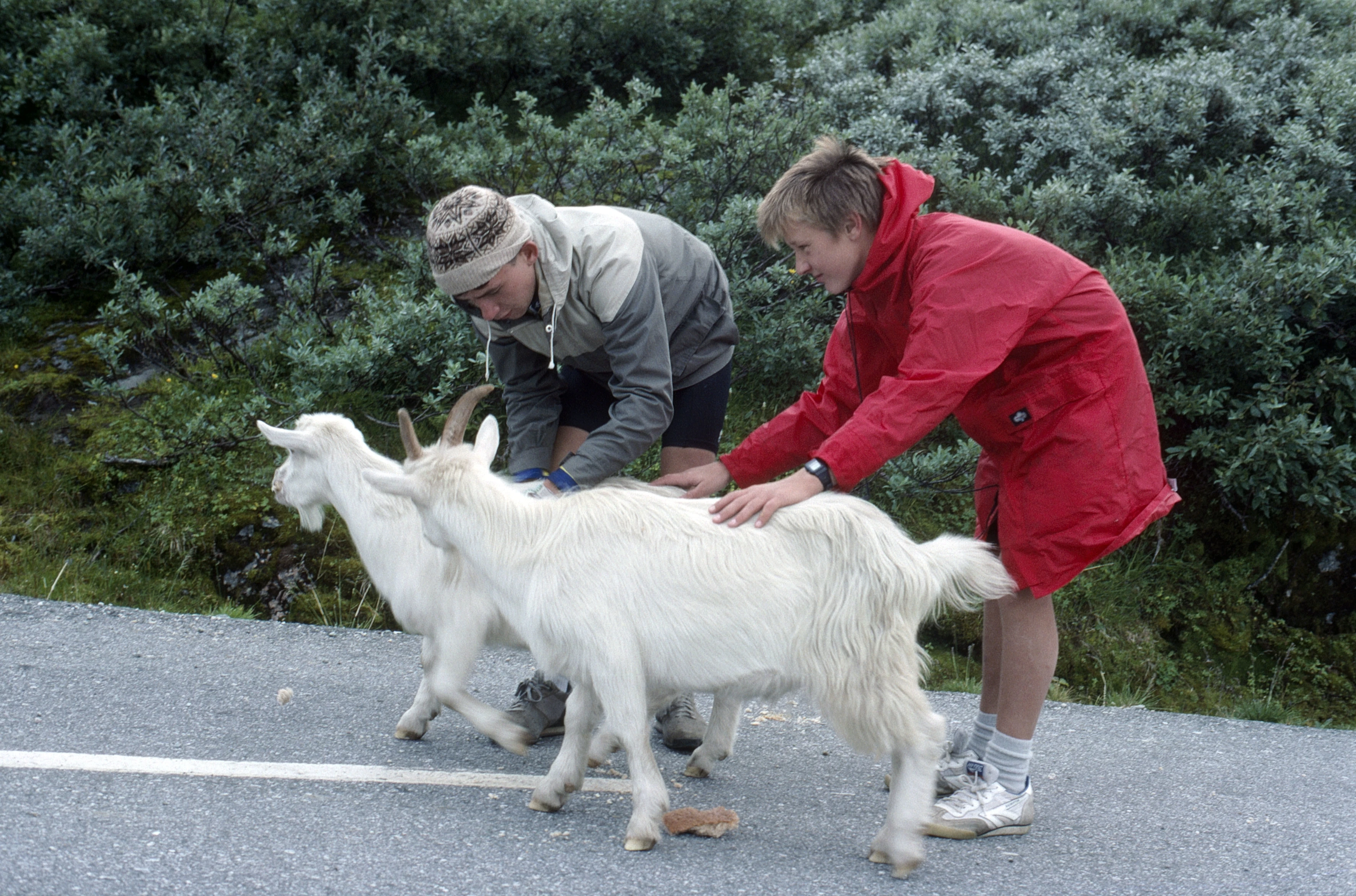 Mark Burnard joins Shane, petting the two goats by the roadside.