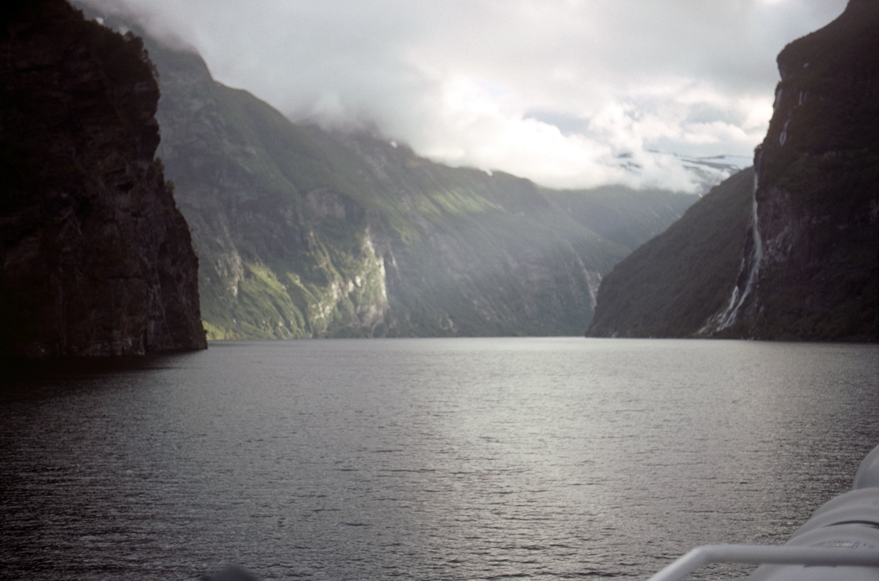 Central Geirangerfjord from the ferry, Seven Sisters cascading on the right.