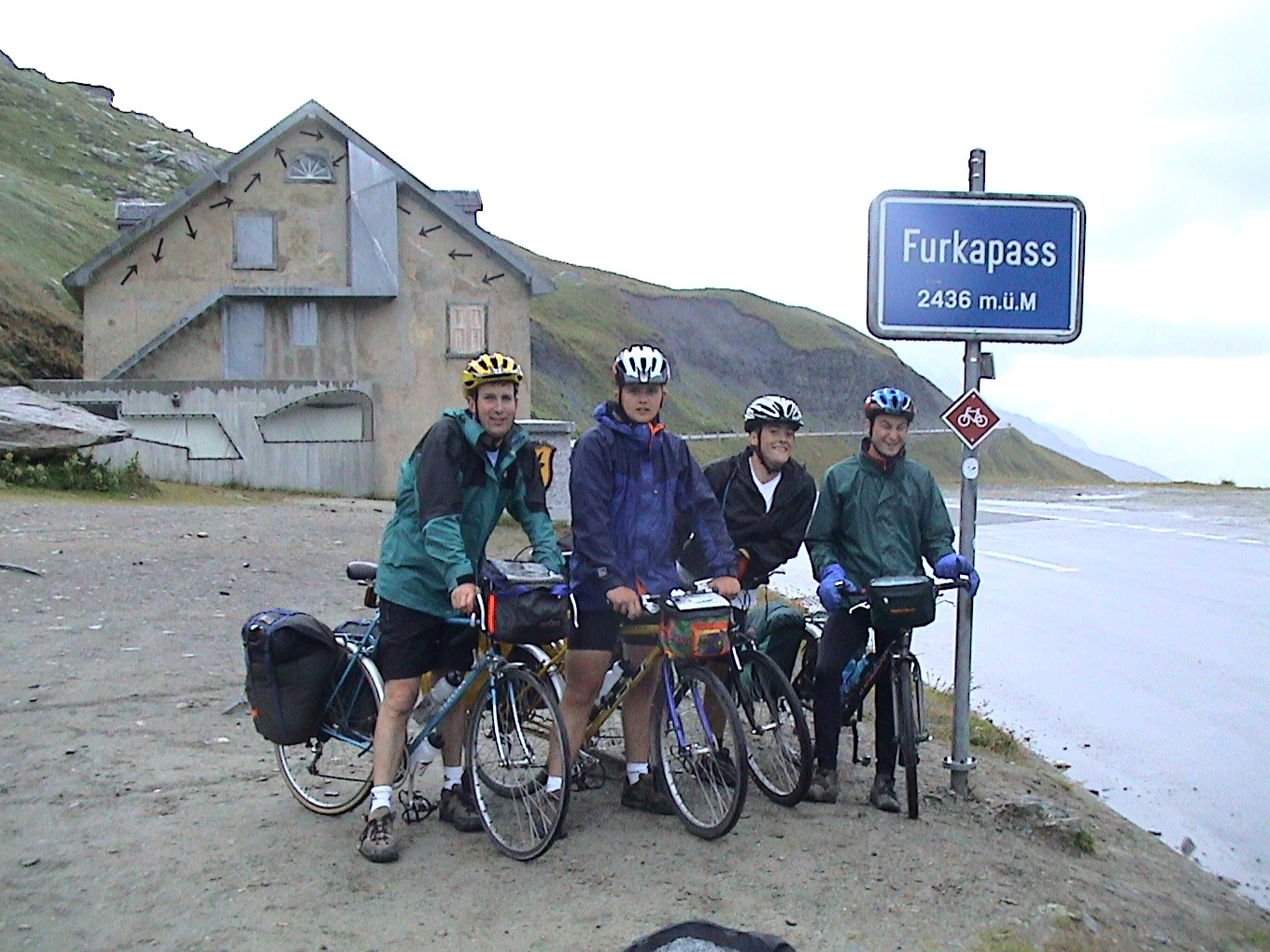 The group at Furkapass, the tour's highest road, 37.9 miles, 2436m.
