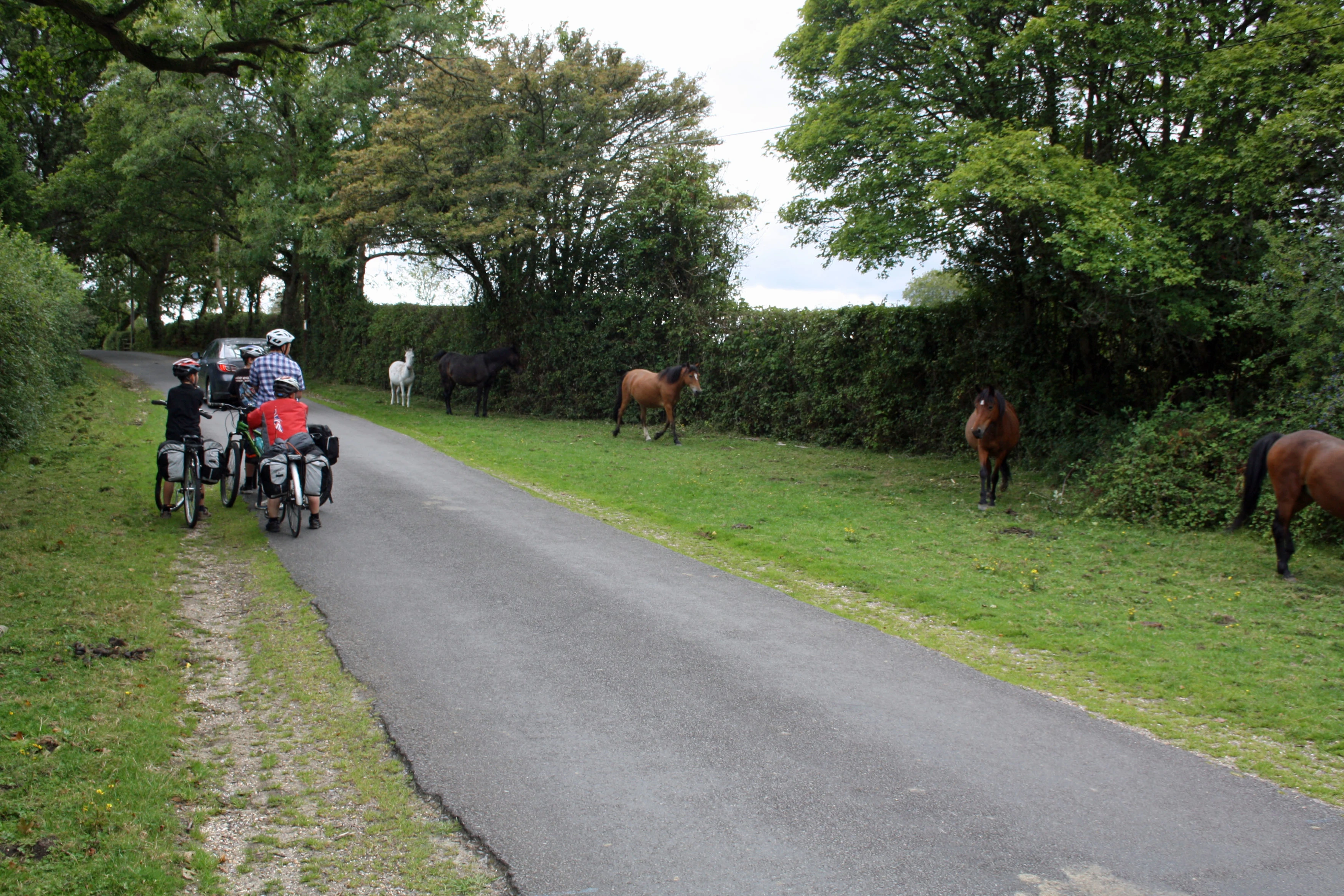 Ponies take turns manuring the verge on the road to the Rufus Stone, 20.9 miles in