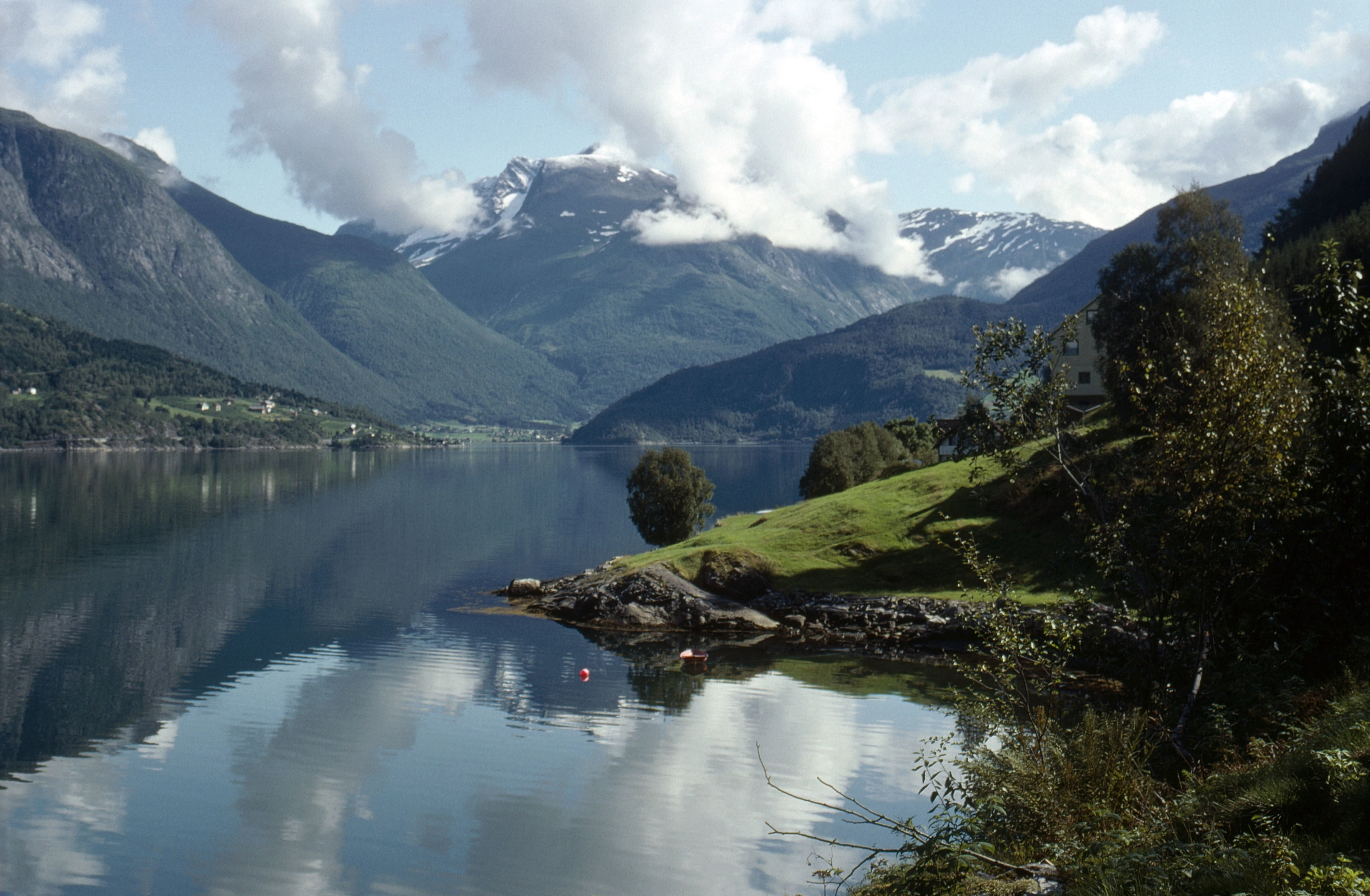 Picture-postcard view back towards Loen over Nordfjord from near Vangberg, the fjord mirror-calm.