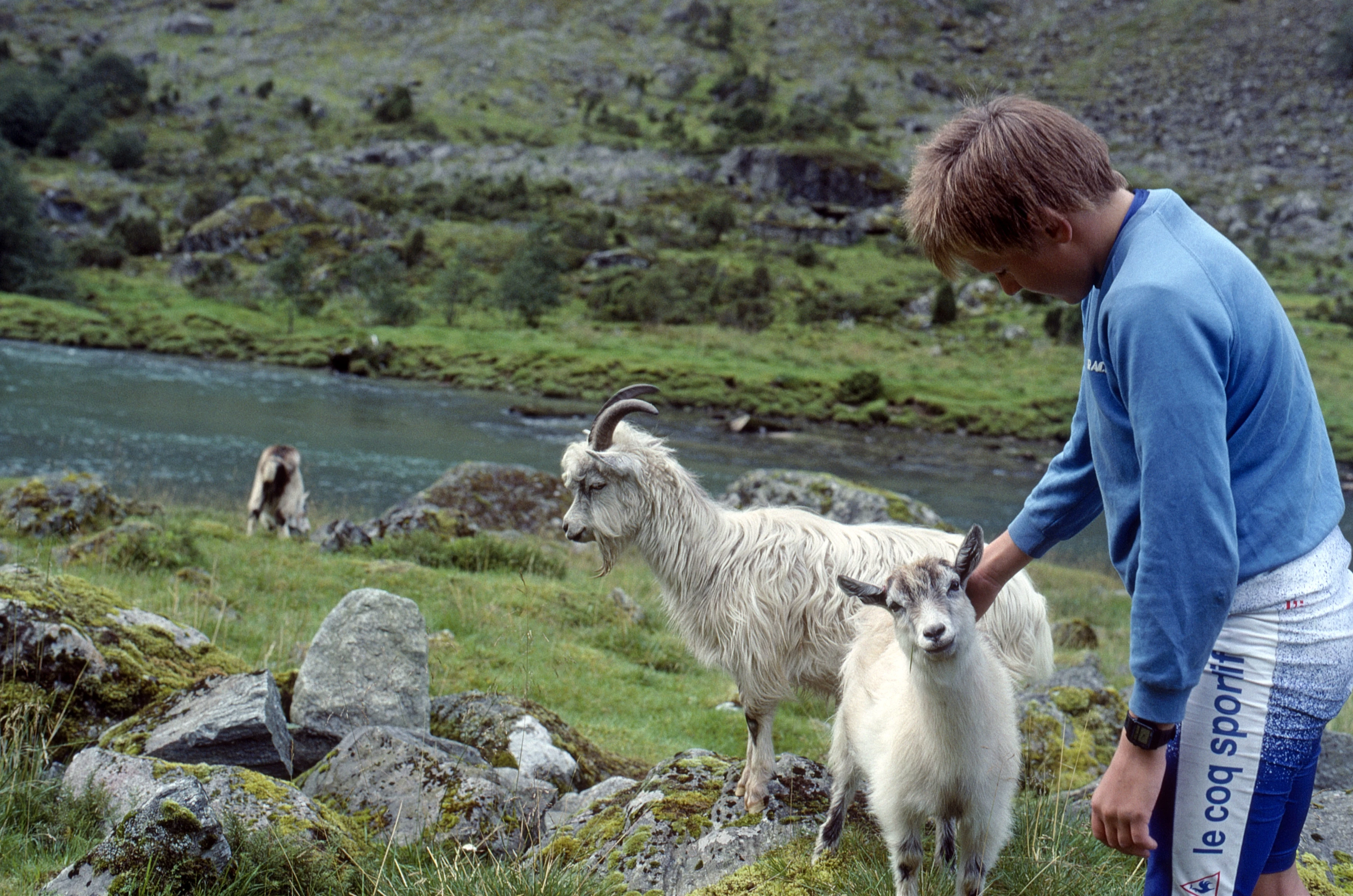 Shane pets one of two friendly dairy goats—clearly enjoying the fuss—by the upper Stardaselva in Våtedalen.