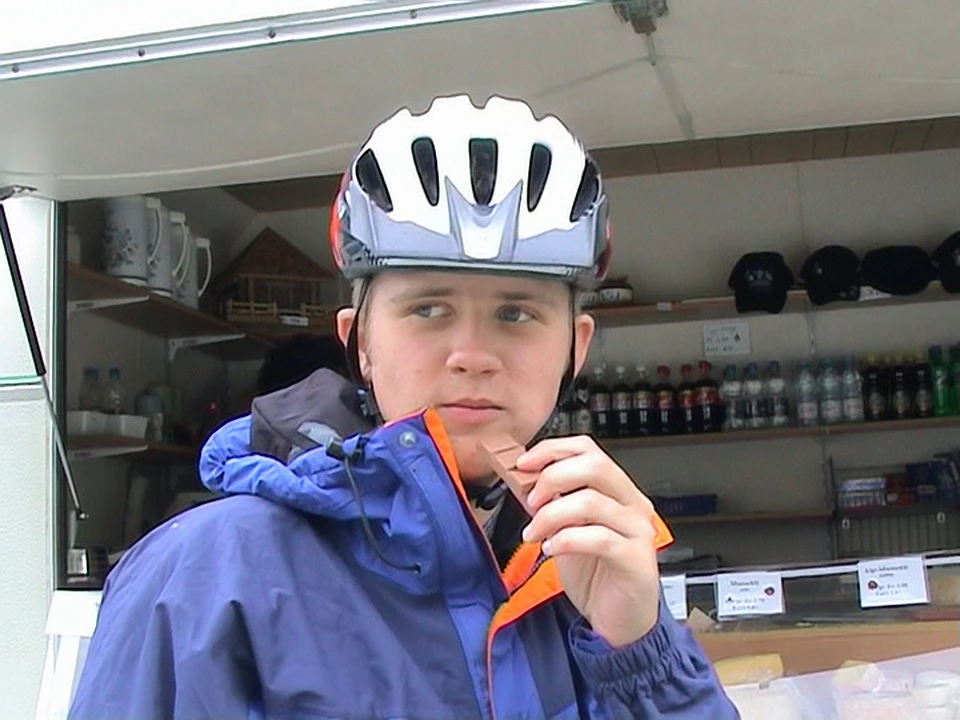 Gavin enjoys chocolate refreshment at Holzofenbrot.