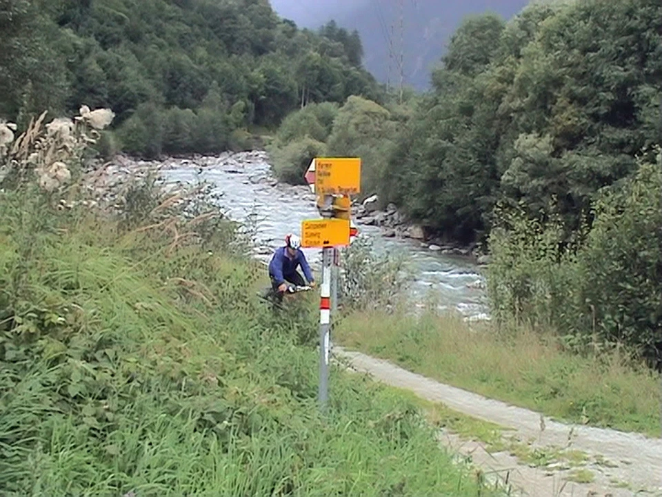 Gavin emerges from the path at our lunch spot, Gassa, Sumvitg. 25.9 miles, 925m.