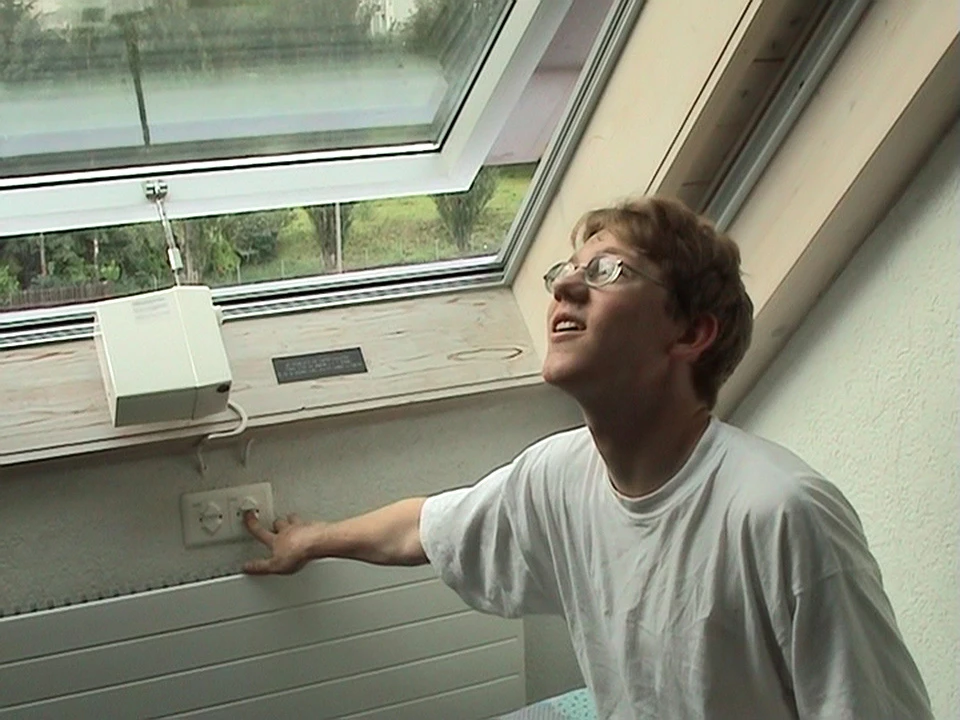 Oliver demonstrates the electric windows in their Ibis Hotel room, Chur.