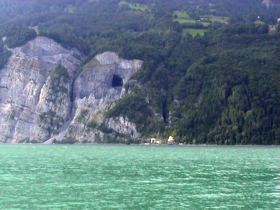 Quarry cave in the rockface above Lake Walen near Walenstadt, 32.6 miles in. A Second World War hospital, now used to test rockfall cages.