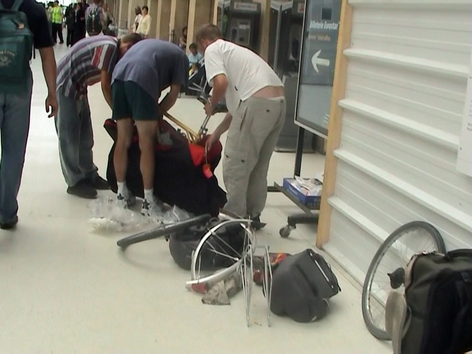 Dismantling bikes and bagging them on the Gare du Nord platform for the 14:43 Eurostar to London.