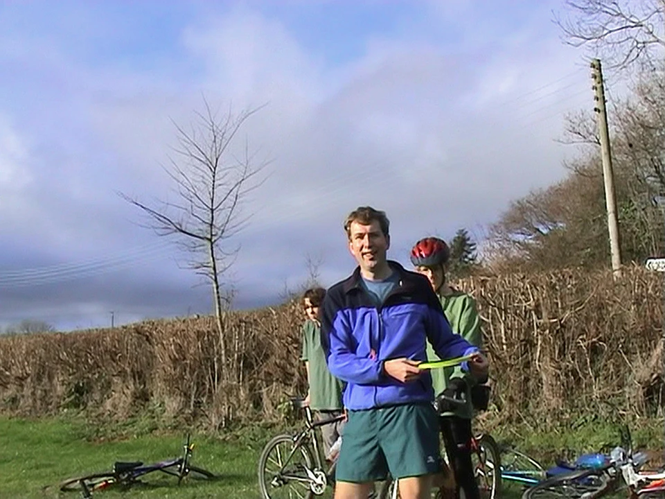 Michael clocks Matthew-the-cameraman's cheeky jibes about his Aerobie skills, Staverton Park.