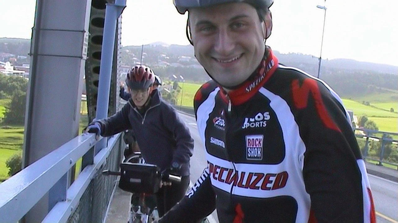 Olly uneasy on Karmsund Bridge; Tao buffeted by the crosswind.