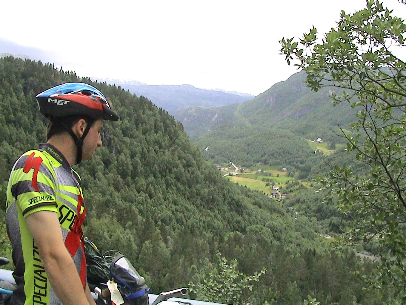 Hairpin vantage: Hellandsbygd below, one mile from the guest house.