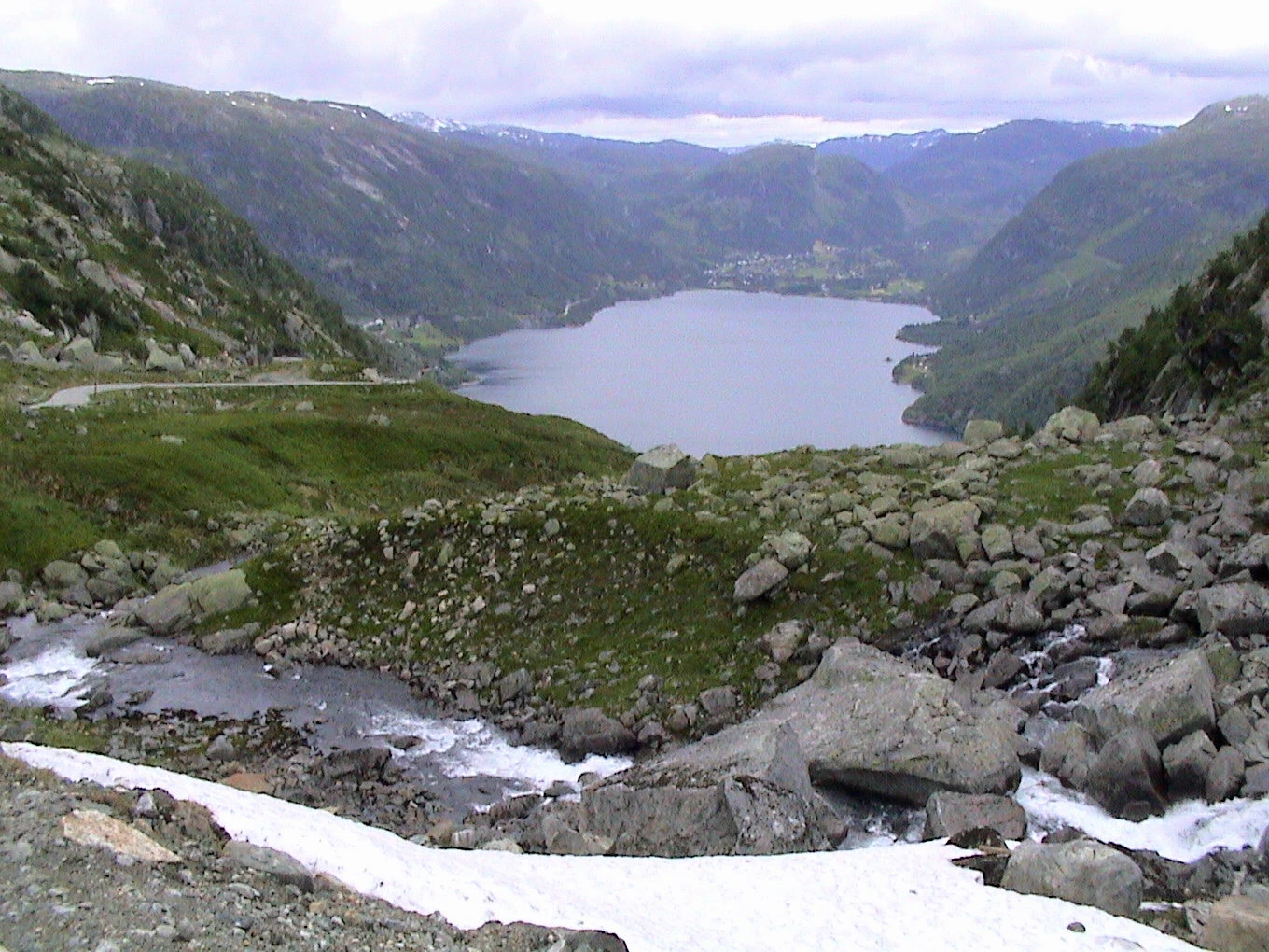 First glimpse of Rødalsvatnet as the big descent begins—12.8 miles in.