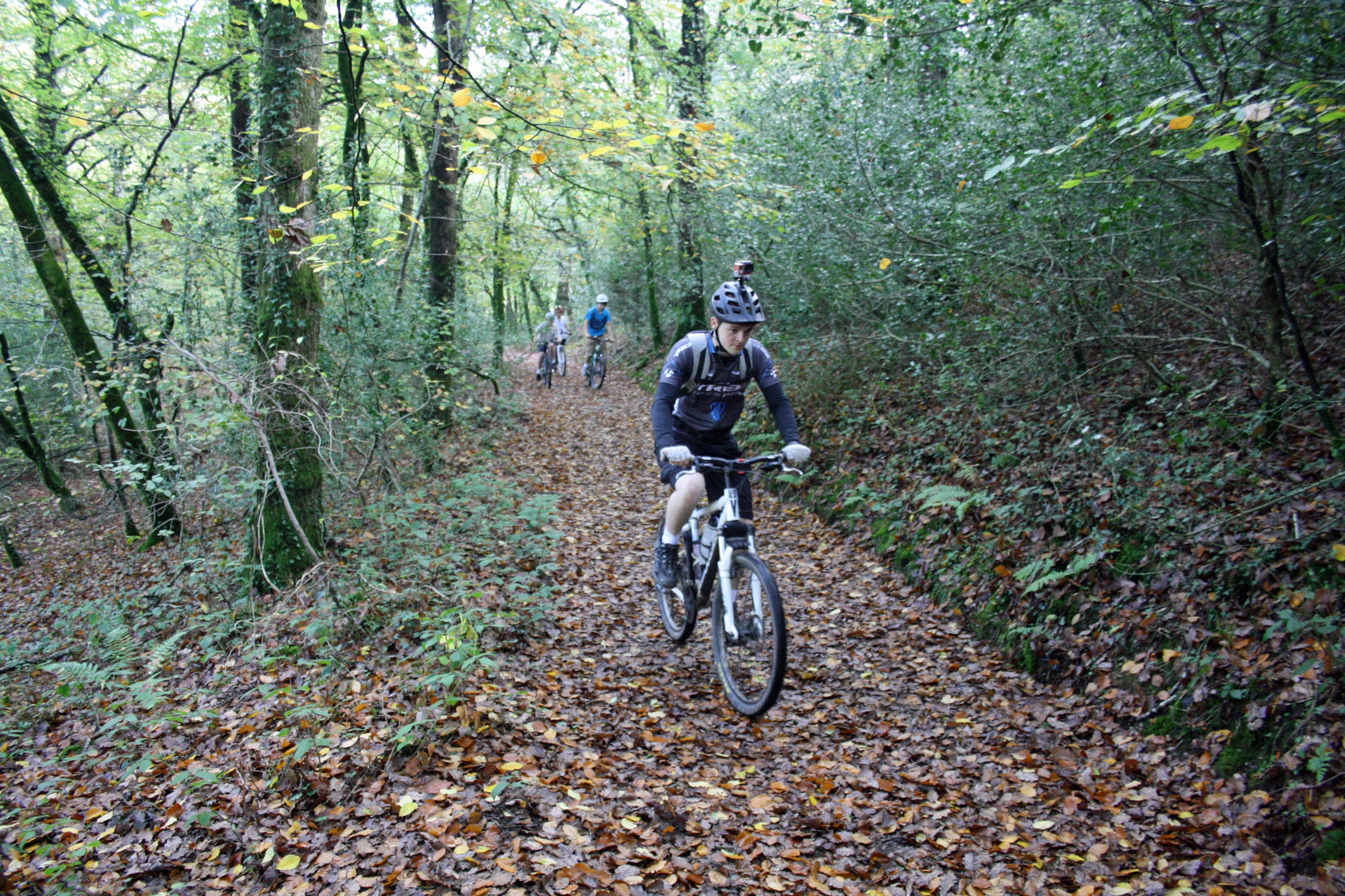 Ash leads the pack, sporting his new helmet cam in Holne Woods.