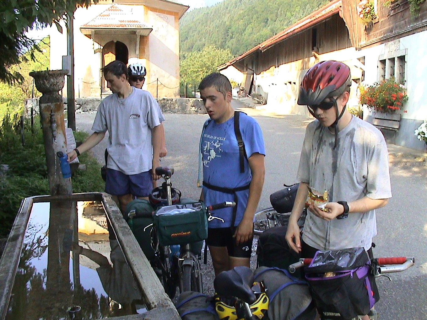 Topping up at the public fountain by Chapelle du Roc, Le Bu, 49.0 miles into the ride