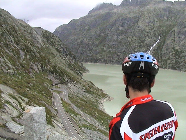 Tao surveys the final hairpins from Grimsel Lake, 26.8 miles, 2049m.