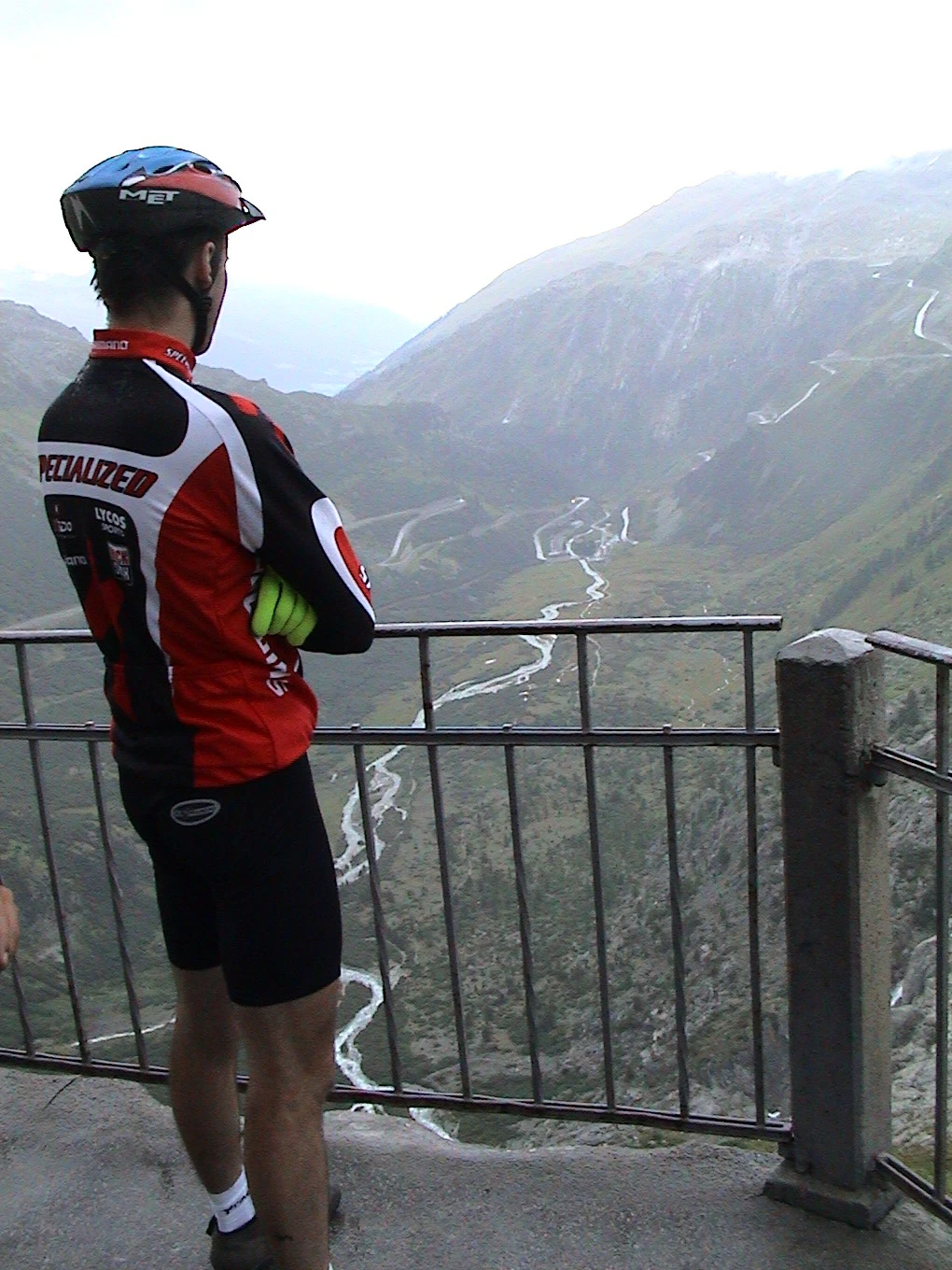 Tao looks back to Gletsch from the Rhone Glacier visitor centre.