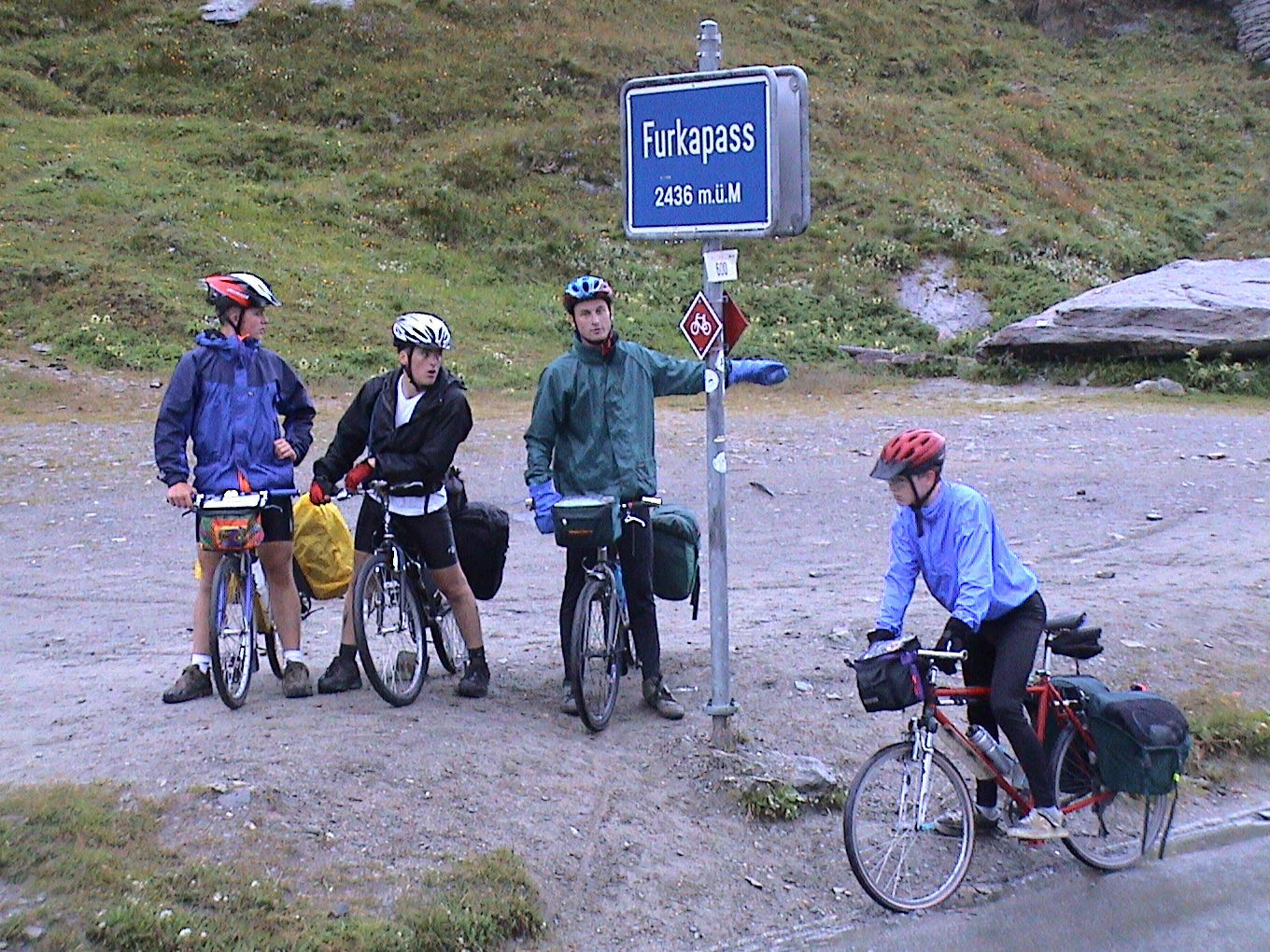The group at Furkapass, the tour's highest road, 37.9 miles, 2436m.