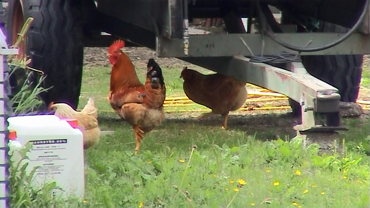 Free‑range chickens patrol the grounds at our Hellandsbygd guest house.