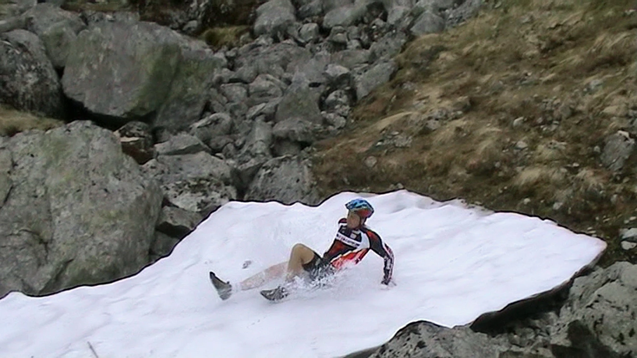 Tao tests our first serious snow patch, 8.2 miles in.