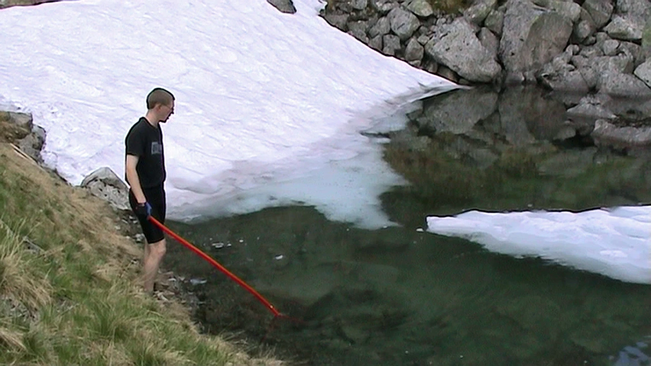 Olly eyes up a roadside mini‑iceberg, 9.9 miles in.