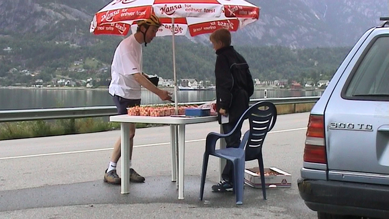 Michael buys cherries from a young lad near Eidfjord—English limited to 'yes' and 'try'. 23.6 miles.