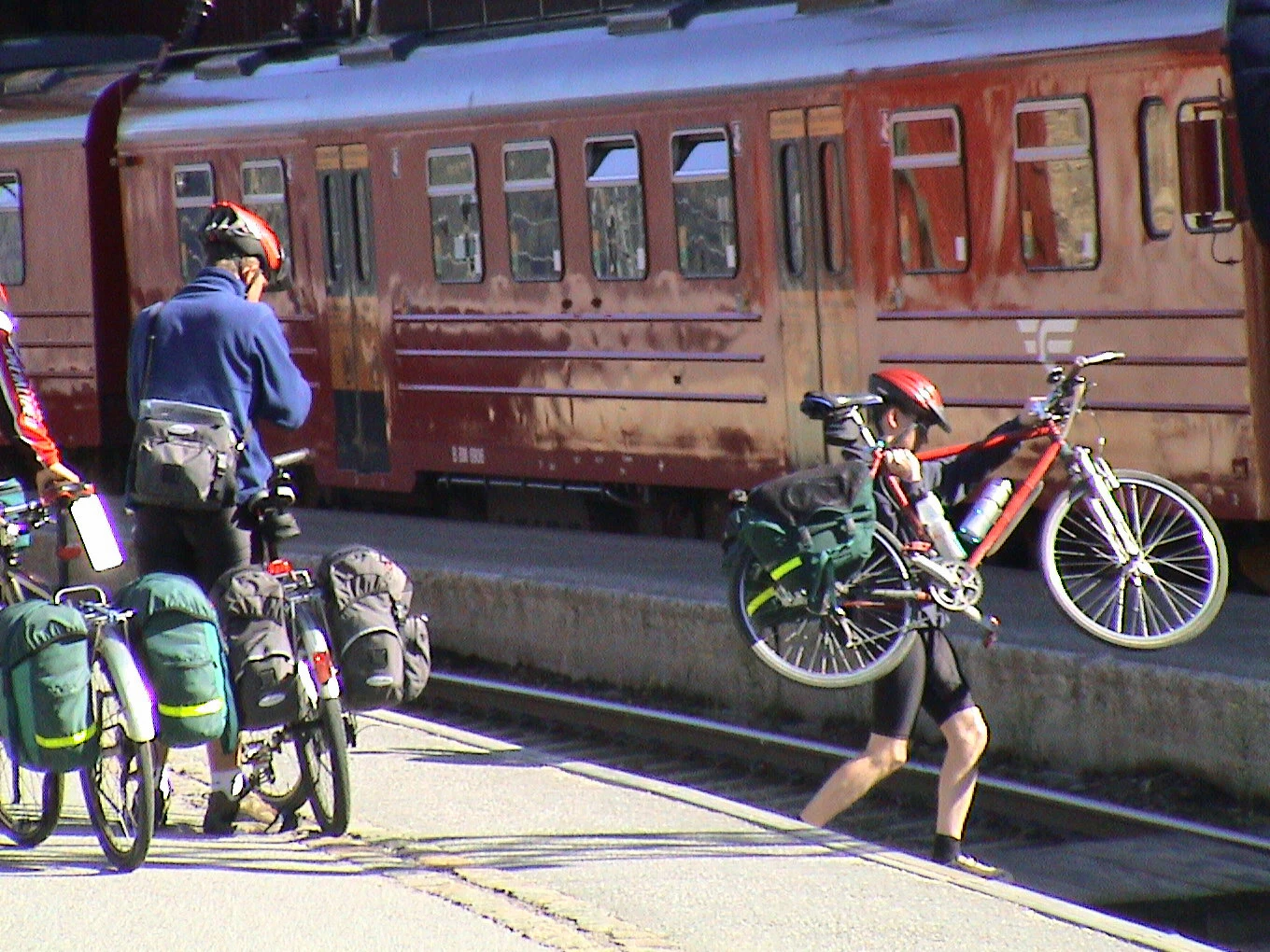 Oliver takes his bike to our train on the next platform, via the short route.