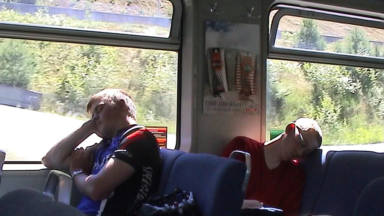 Gavin and Oliver seize a nap on the train from Voss to Bergen.