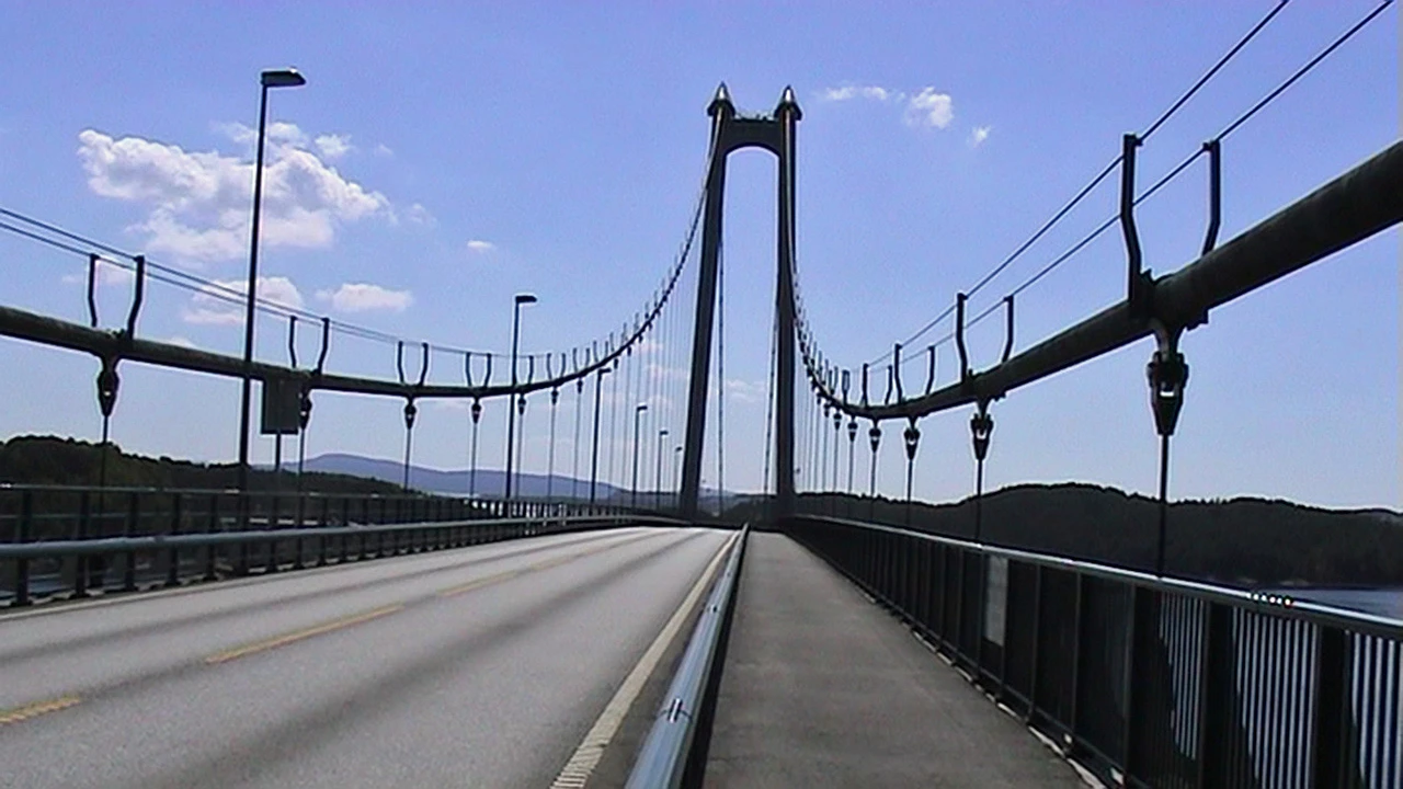 Crossing the 1,078 m Storda Bridge to Føyno, 13.7 miles in.
