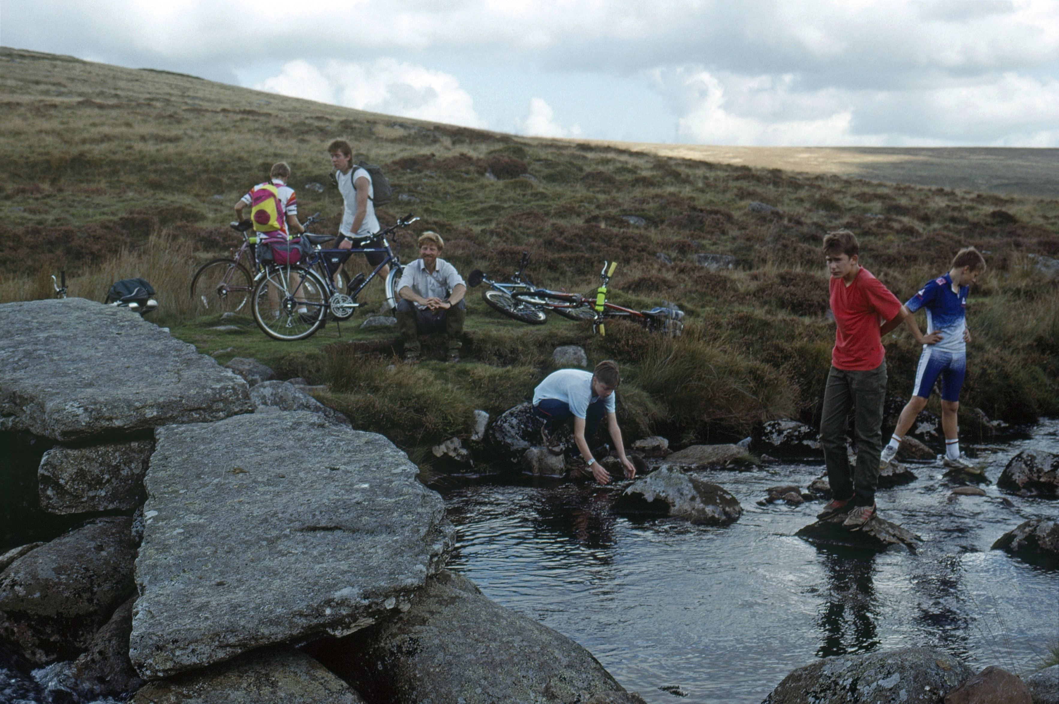 At the clapper bridge over the Avon behind Avon Dam: some across already, others hopping big stones.
