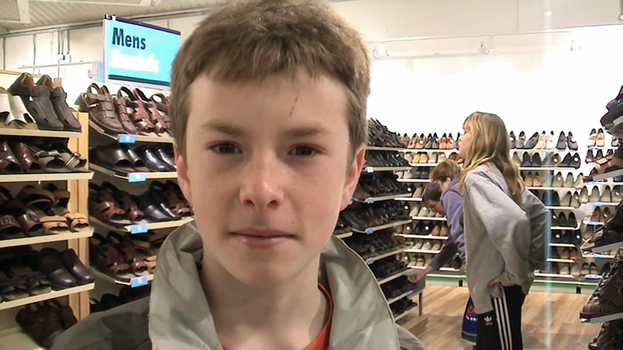 Joe checks if the camcorder is recording in the Clarks Shoe Shop, Clarks Village—1.7 miles from the hostel.