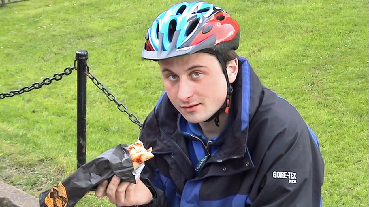 Tao enjoying his… pizza?… outside Wells Cathedral.
