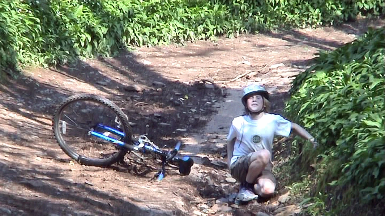 Louis comes off his bike on Corkscrew Hill, so much for the 'how-to' demo. 29.3 miles in.