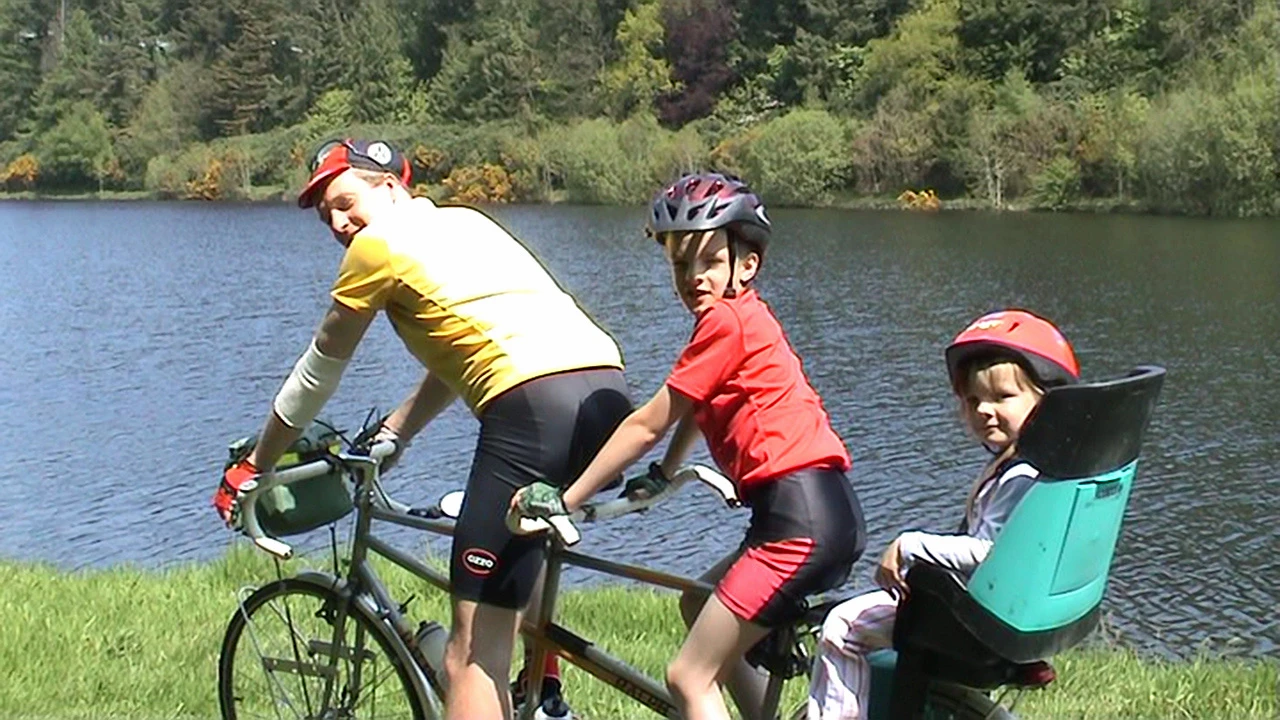 Kevin and family on the tandem by Tottiford Reservoir, 16 miles into the ride