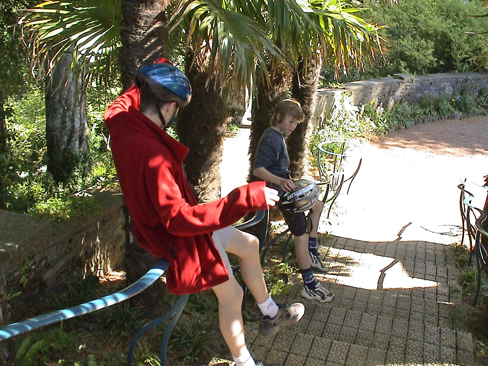 Will and Louis slide the handrail at the hostel entrance after our Overbeck’s tour.