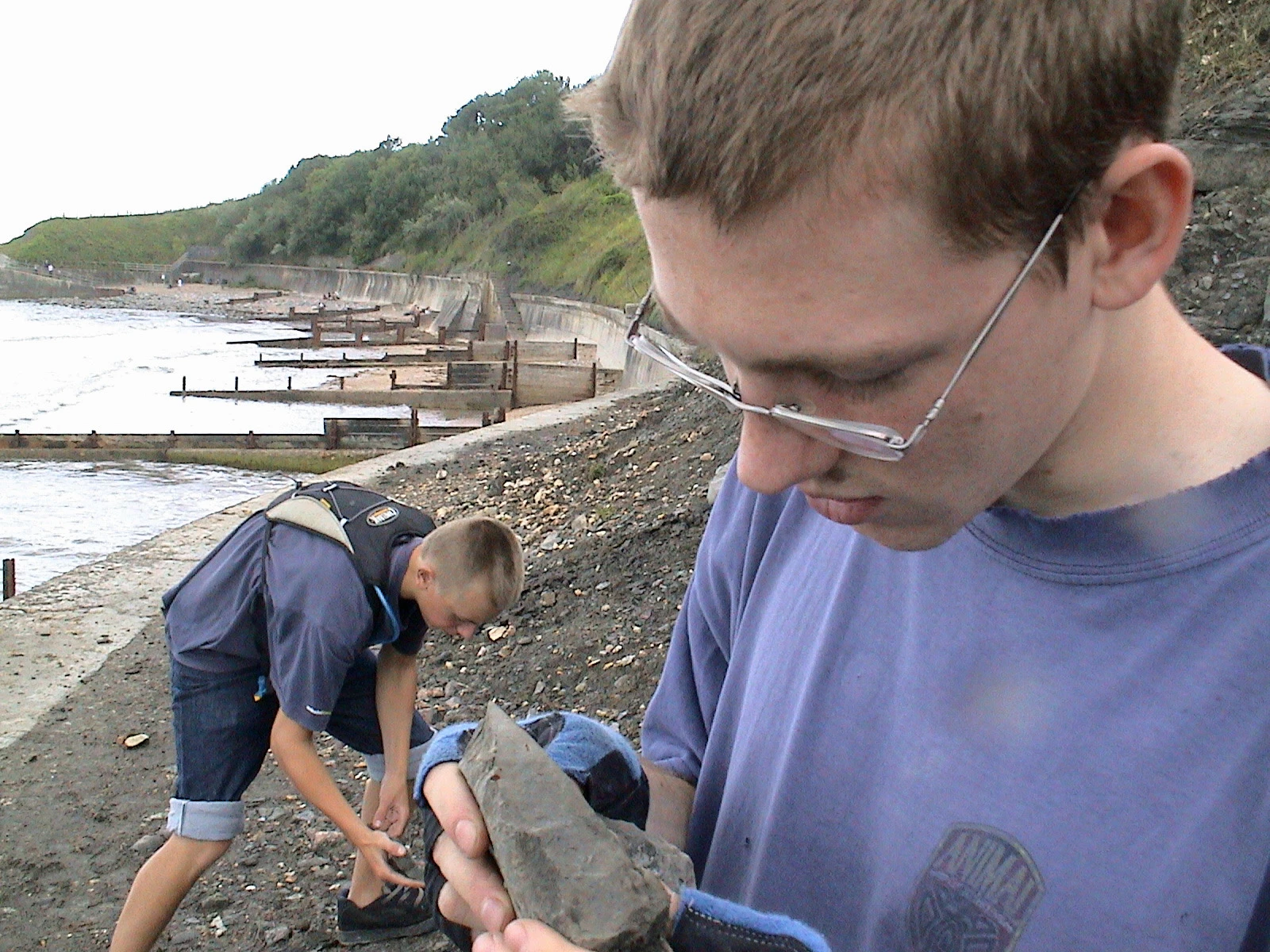Olly inspects a possible fossil on Lyme Regis Beach.
