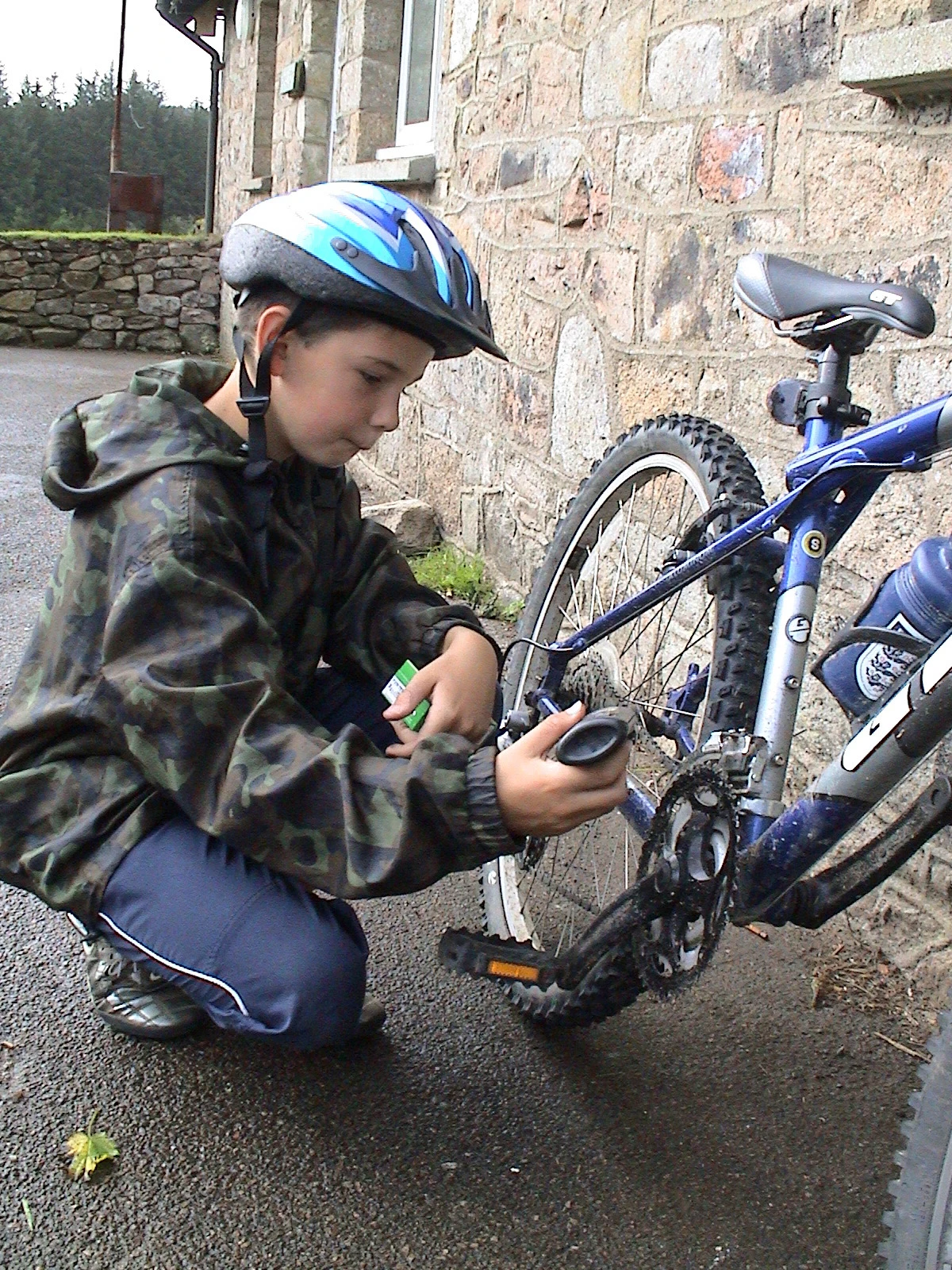Harry oils his chain with Michael's cycle oil outside Bellever Youth Hostel.