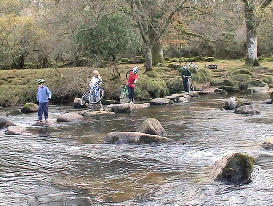Crossing the stepping stones near Dartmeet with our bikes. 8.6 miles in.