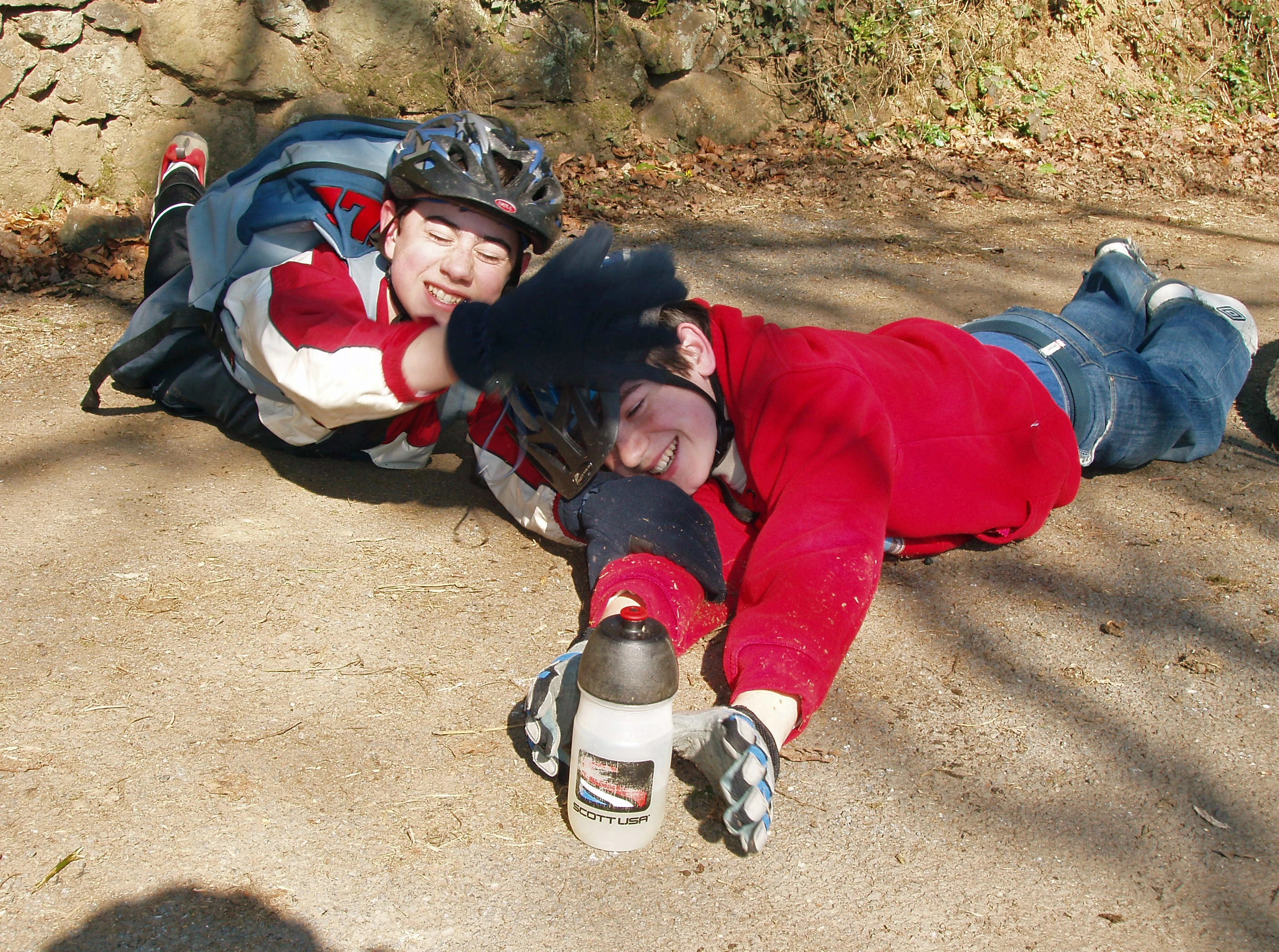 Keir and Sol scrabble for the last drops of energy drink.