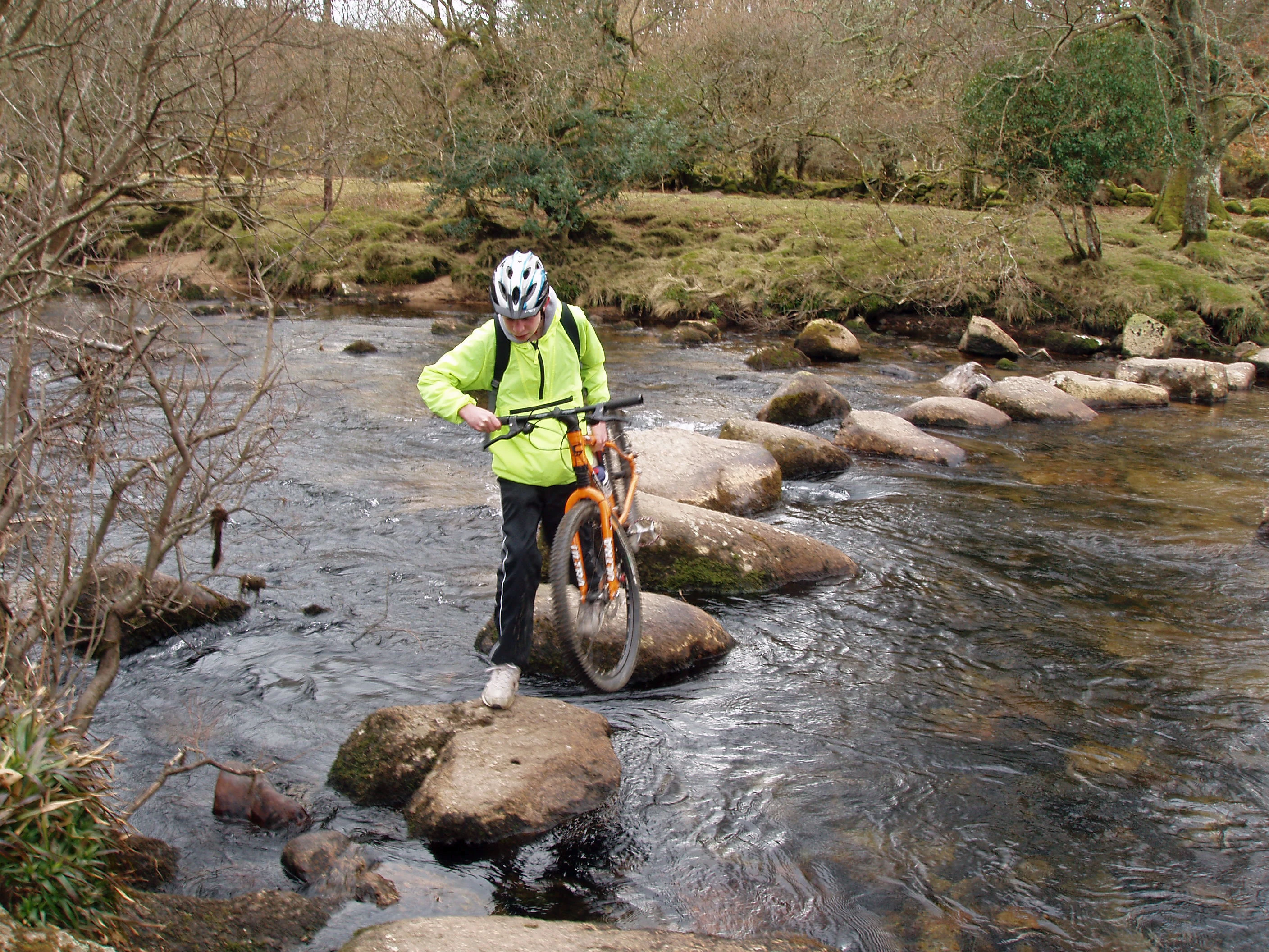Peter Heathman picks his way across Dartmeet's stepping stones.