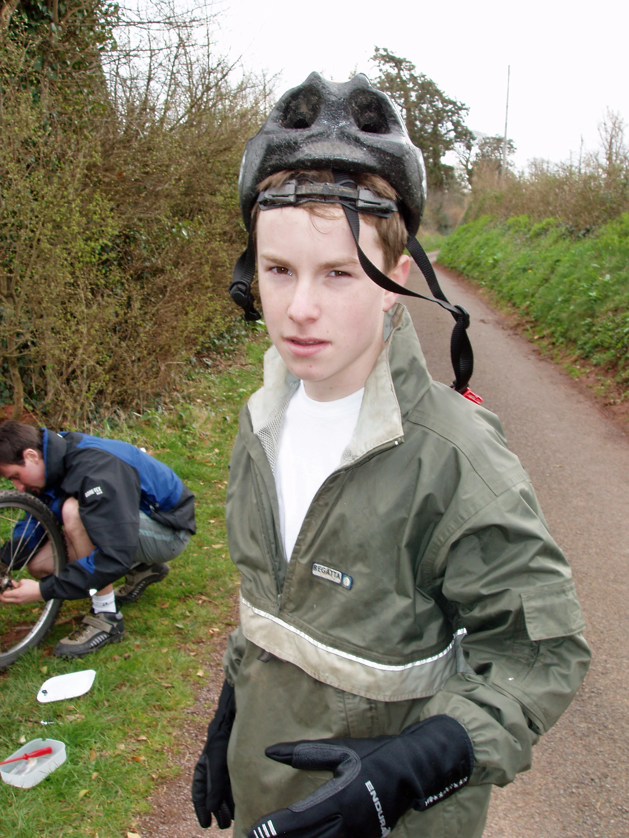 Joe waits anxiously as his bike’s repaired at our Terhill lunch stop, 14.0 miles in.
