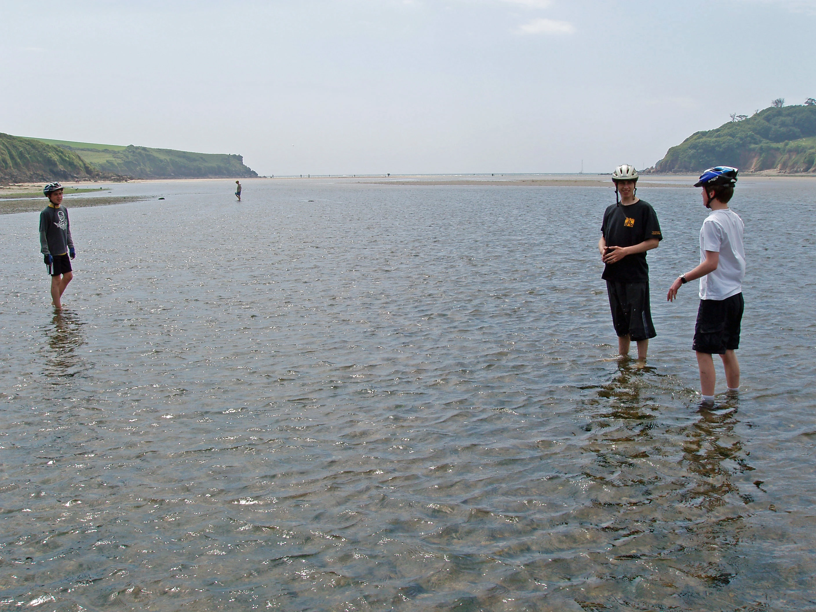 Keir, Will and Joe in the shallows of the Erme estuary.