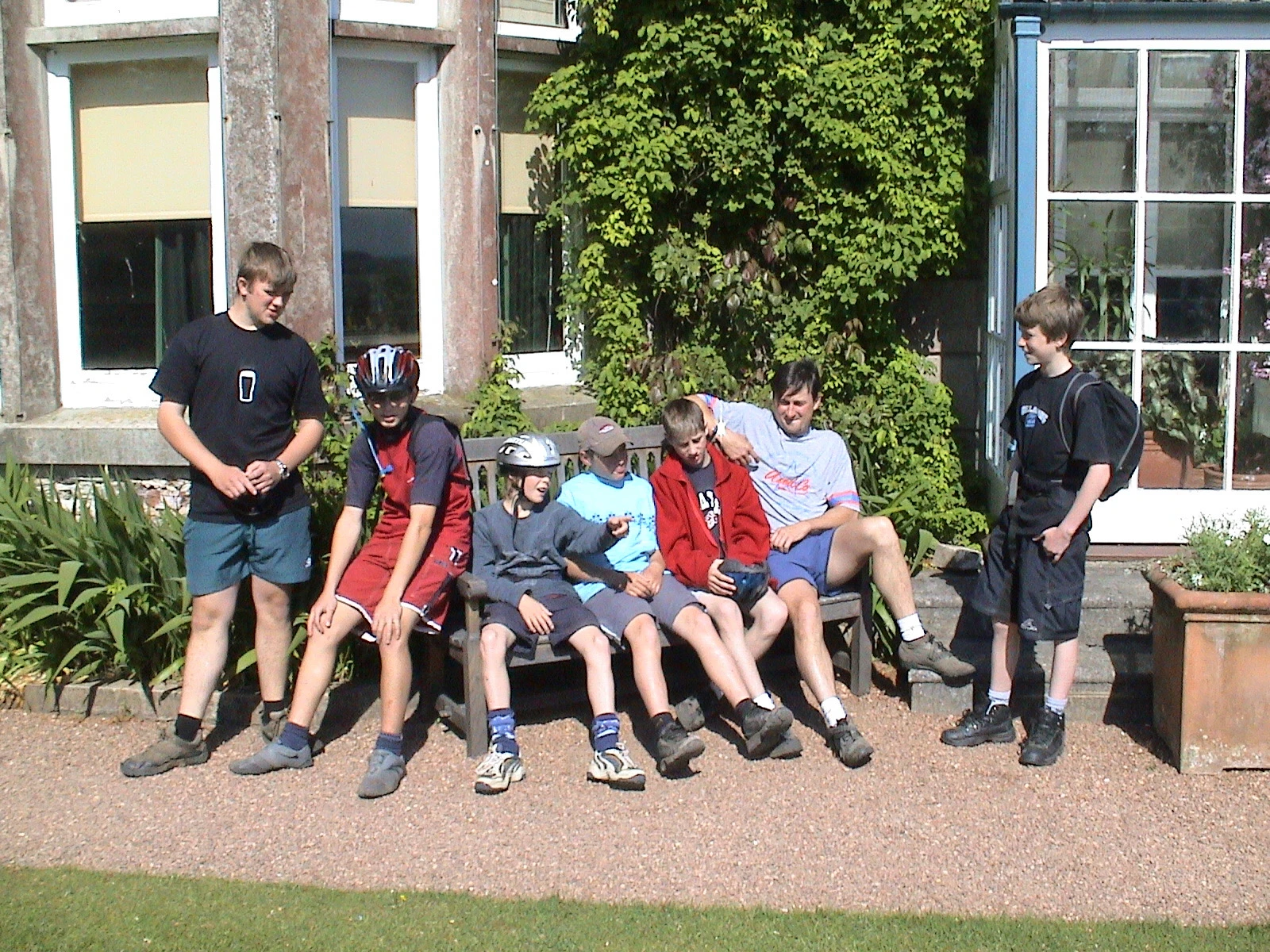 Gavin, Ashley, Louis, James, Will, Tao and Joe outside Salcombe Youth Hostel.