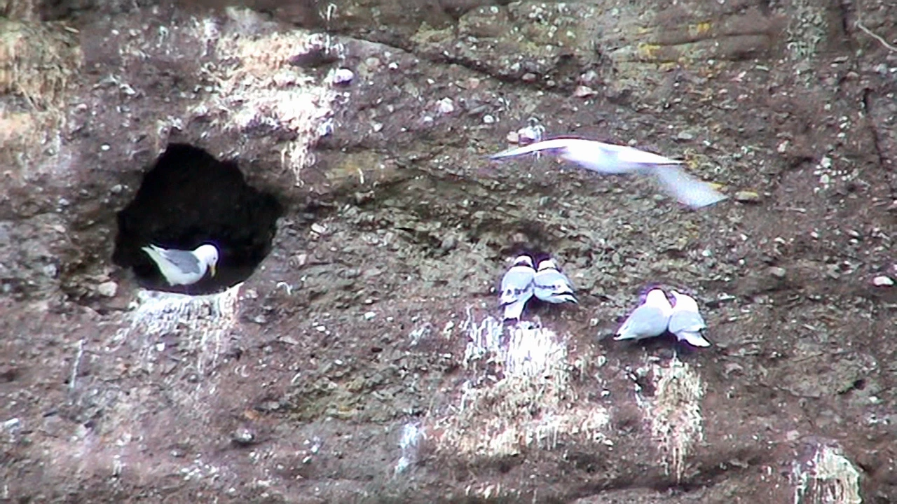 Kittiwakes crowd the cliff opposite Kittiwake's Rock, Dunmore East