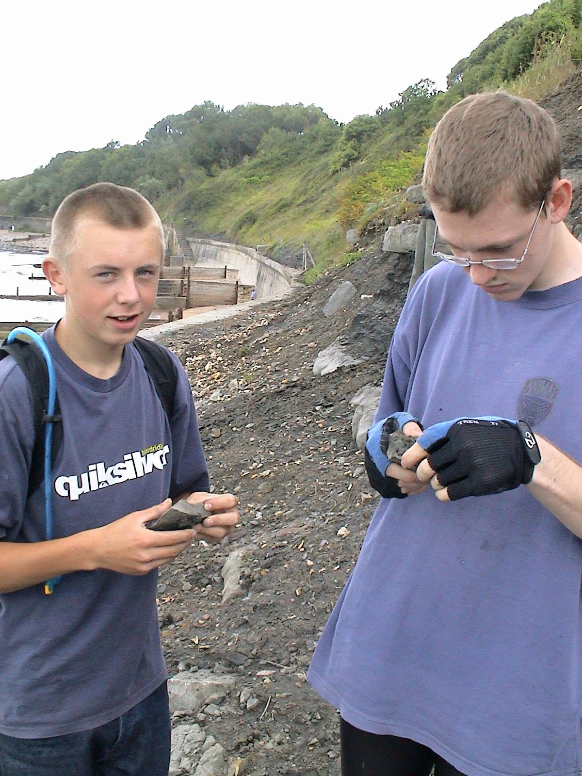 Ashley and Oliver look for fossils on Lyme Regis Beach.