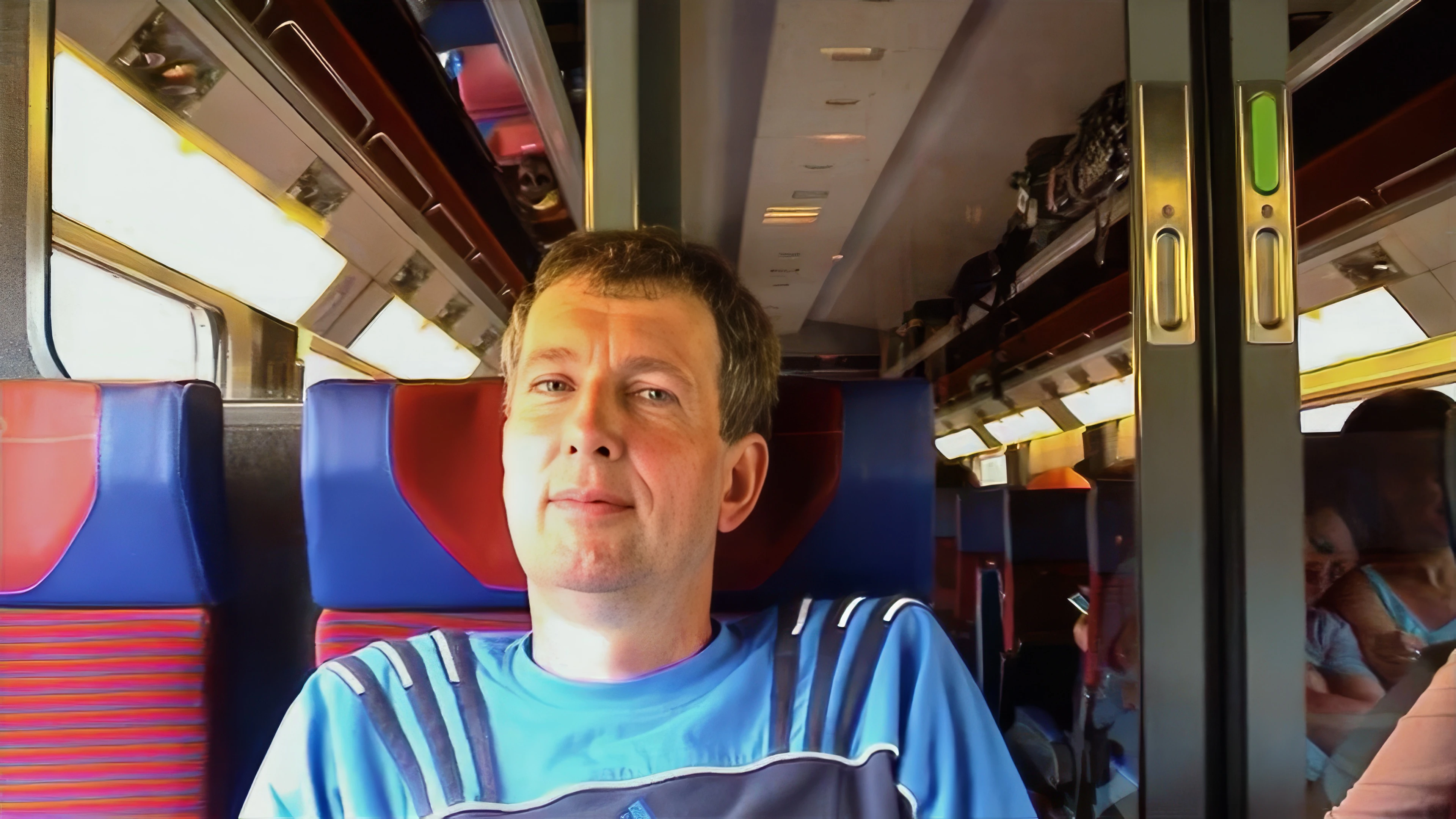 Michael keeps an eye on Joe larking about with the camcorder on the 09:22 TGV to Paris.