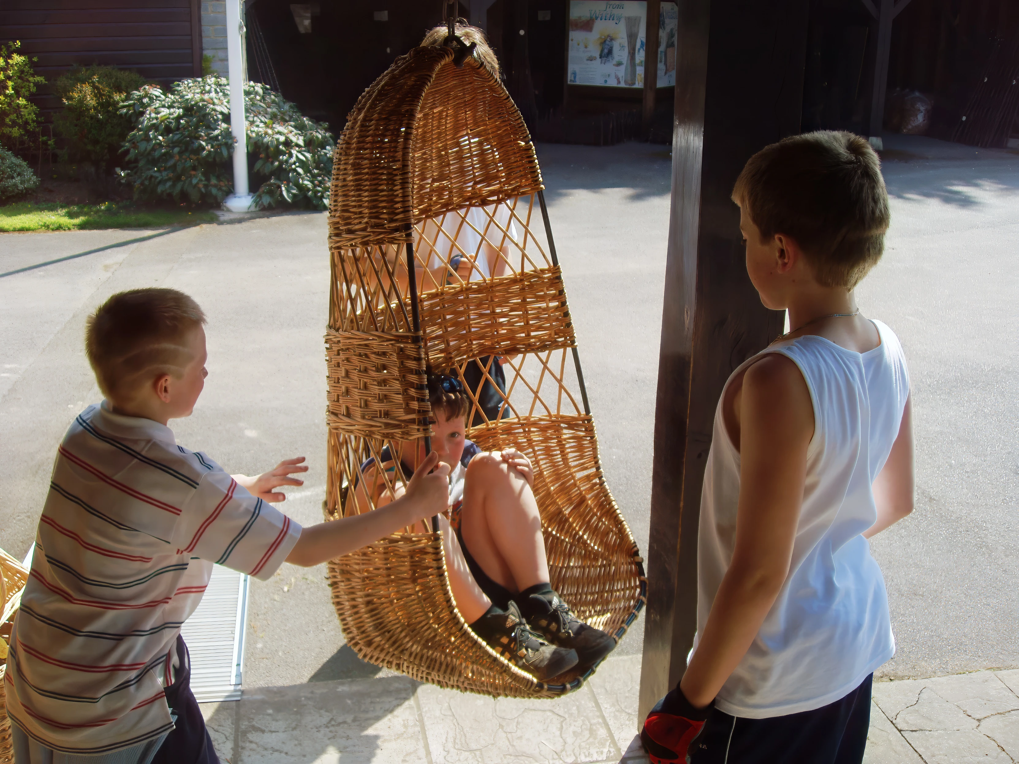 Ashley on the willow seat at the Willows and Wetlands Visitor Centre.