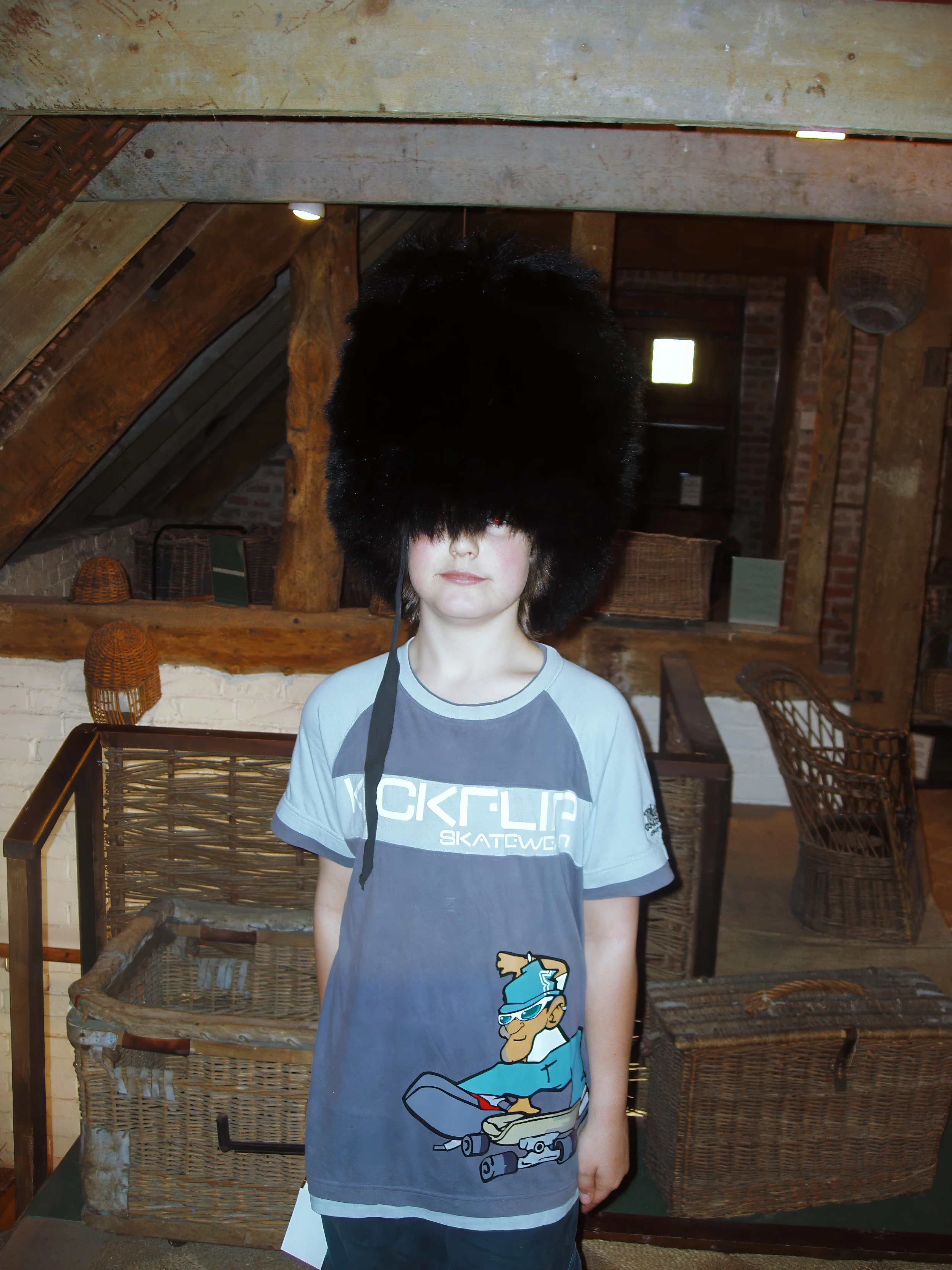 Zac tries on the bearskin at the Willows and Wetlands Visitor Centre, Meare Green.
