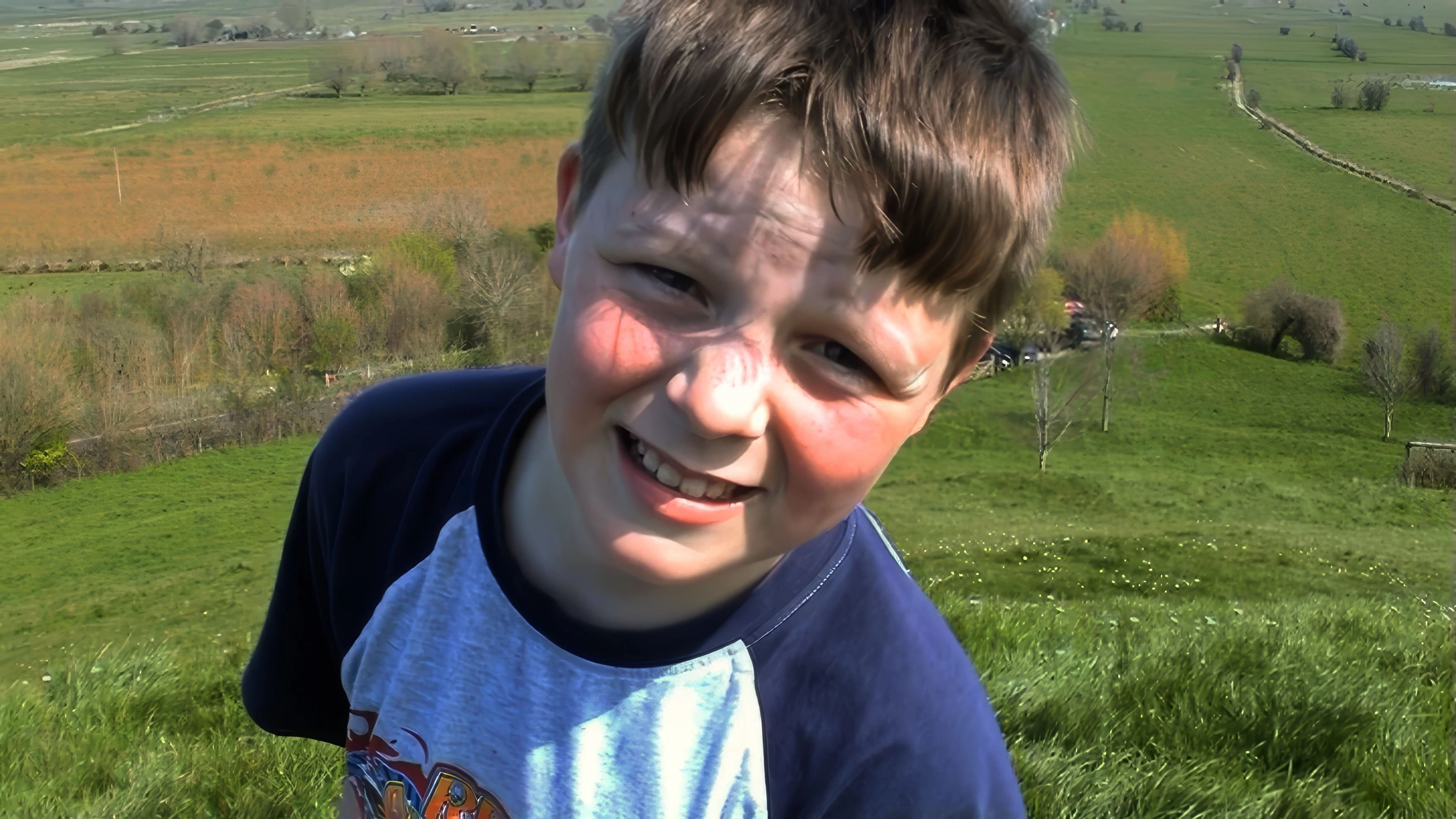 Ash introduces himself on camera after rolling down Burrow Mump.