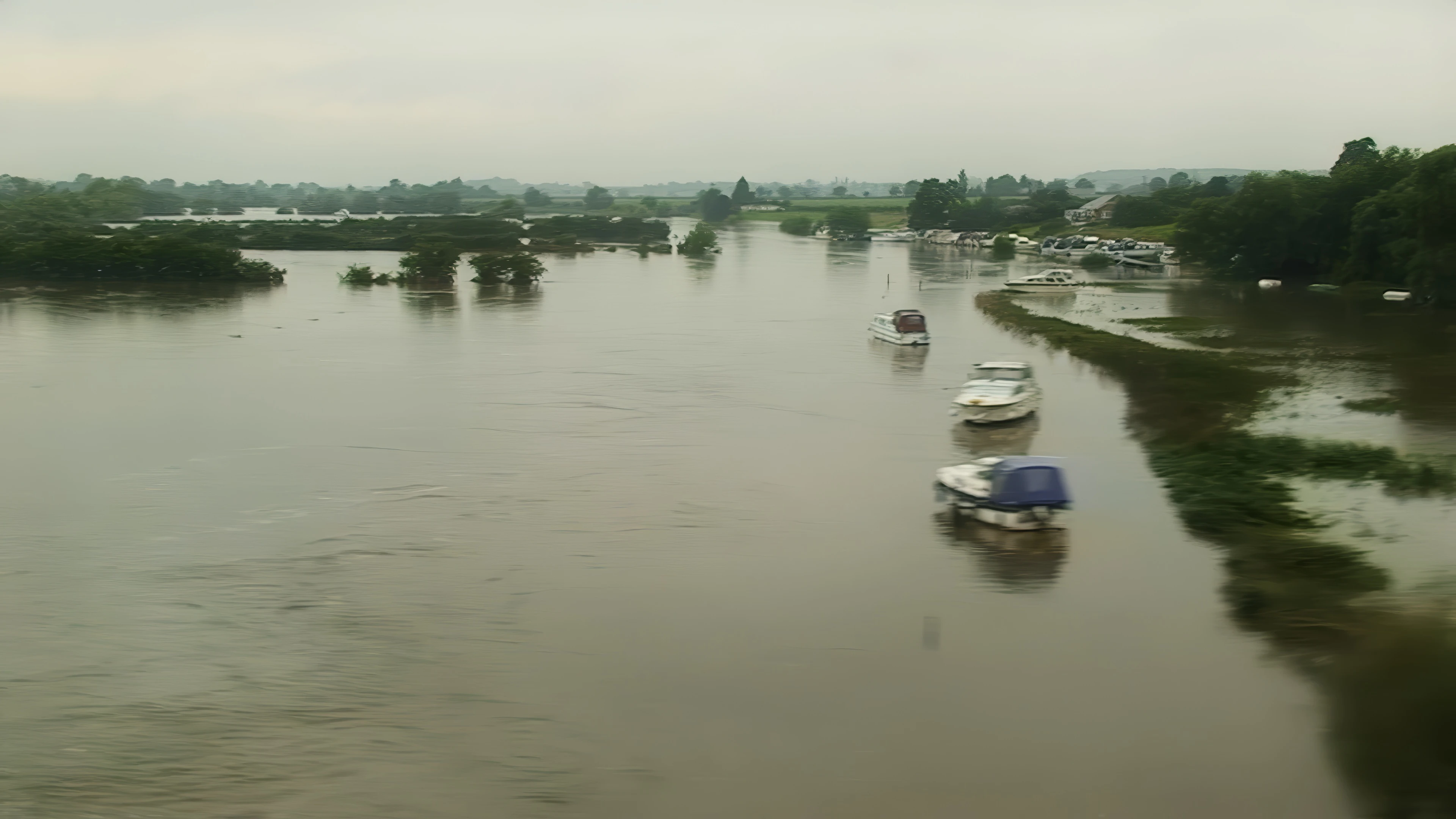 River Avon in full flood at Defford Marina; overnight deluge crippled the railways.